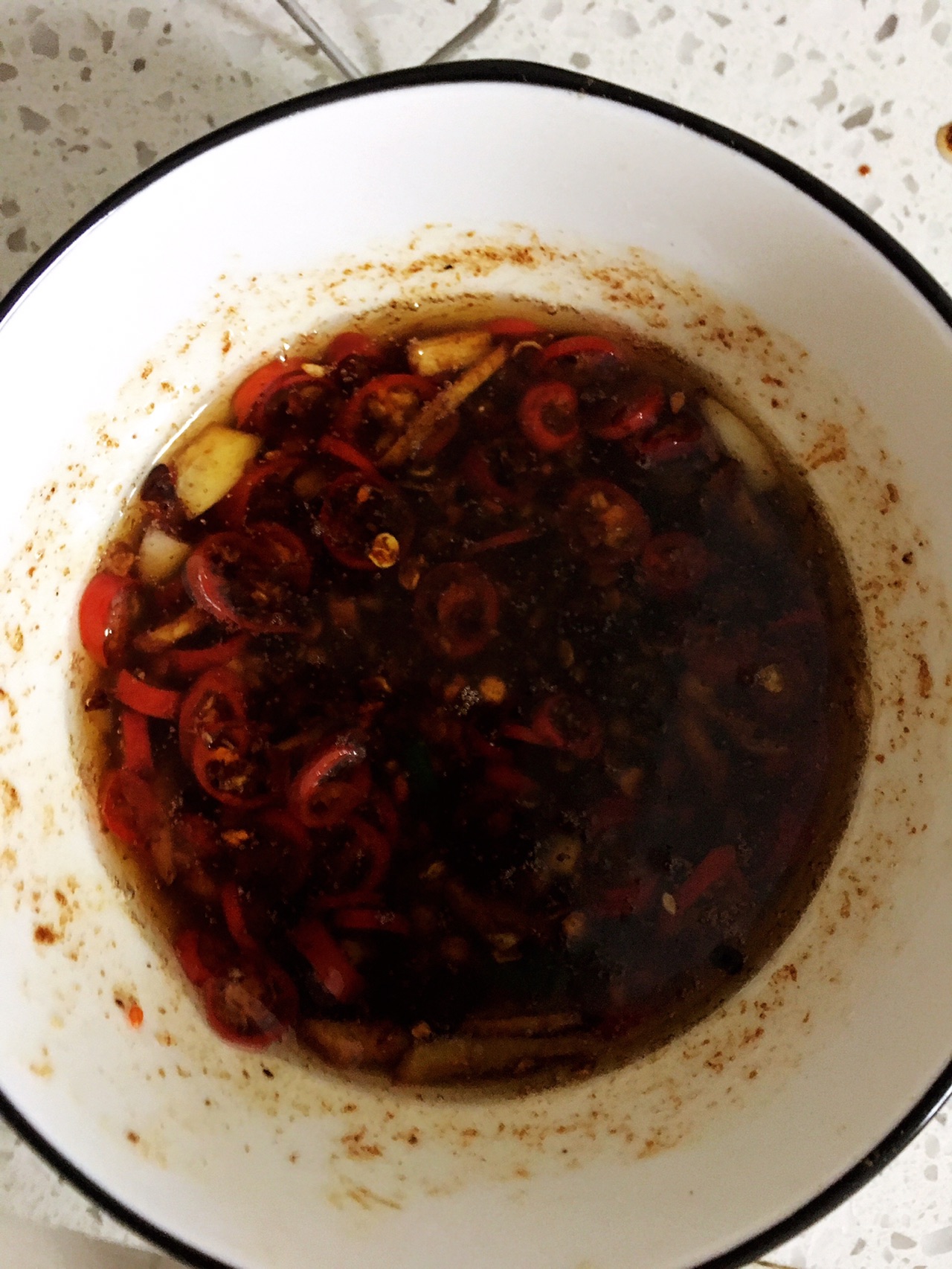 辅料:细辣椒粉一勺、小红椒3只、老抽2勺、生抽2勺、蚝油2勺、醋2勺、孜然粉半勺、花椒粉半勺、糖半勺、盐适量、蒜瓣两瓣、生姜两片、葱和香菜适量