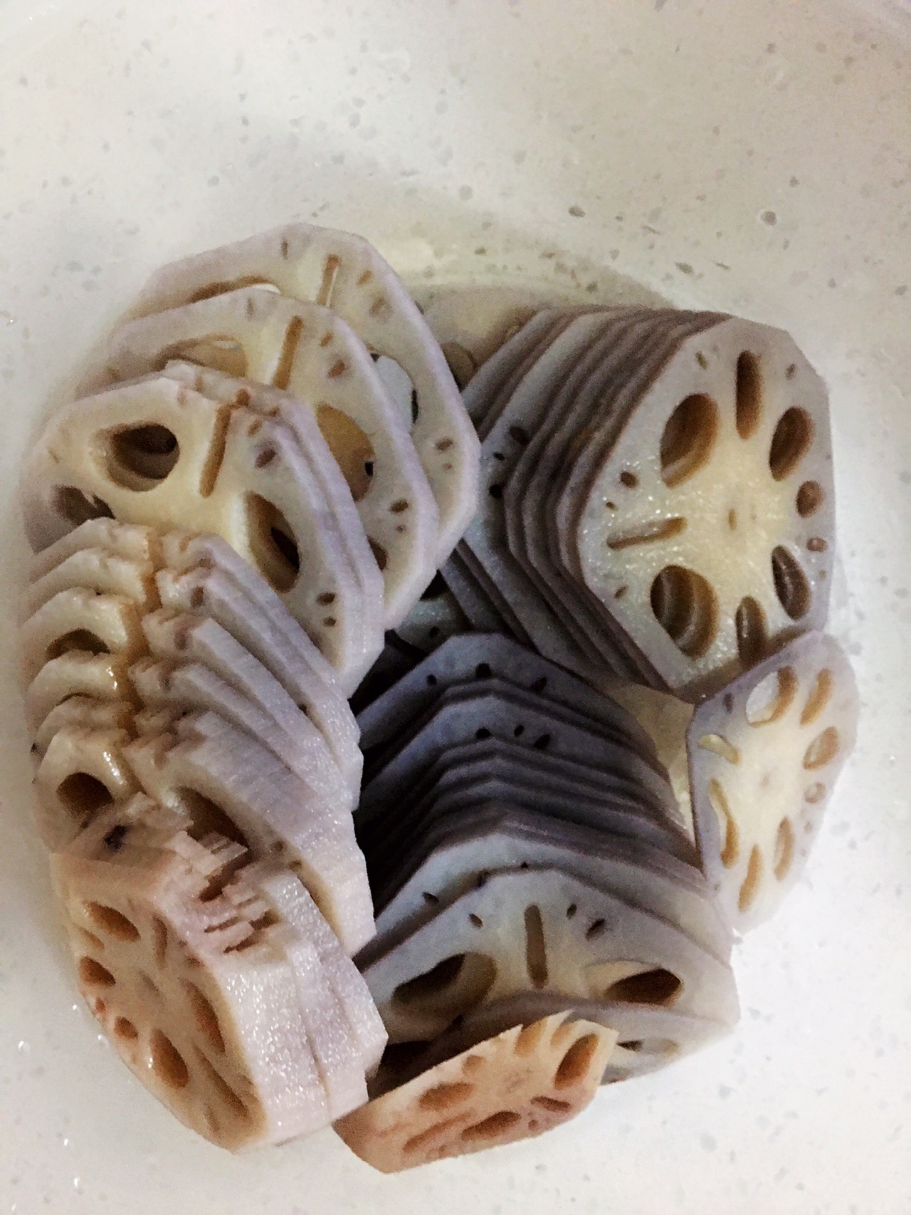 步骤5、莲藕煮熟以后用冷水浸泡几分钟后切薄片,装入大碗中。