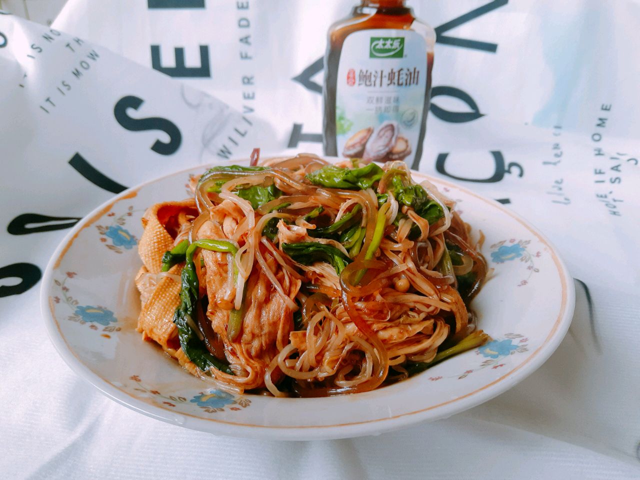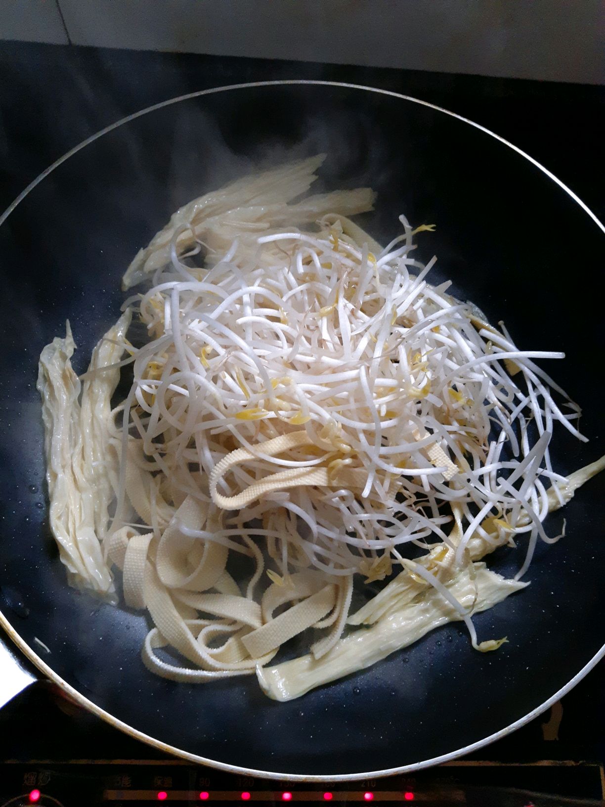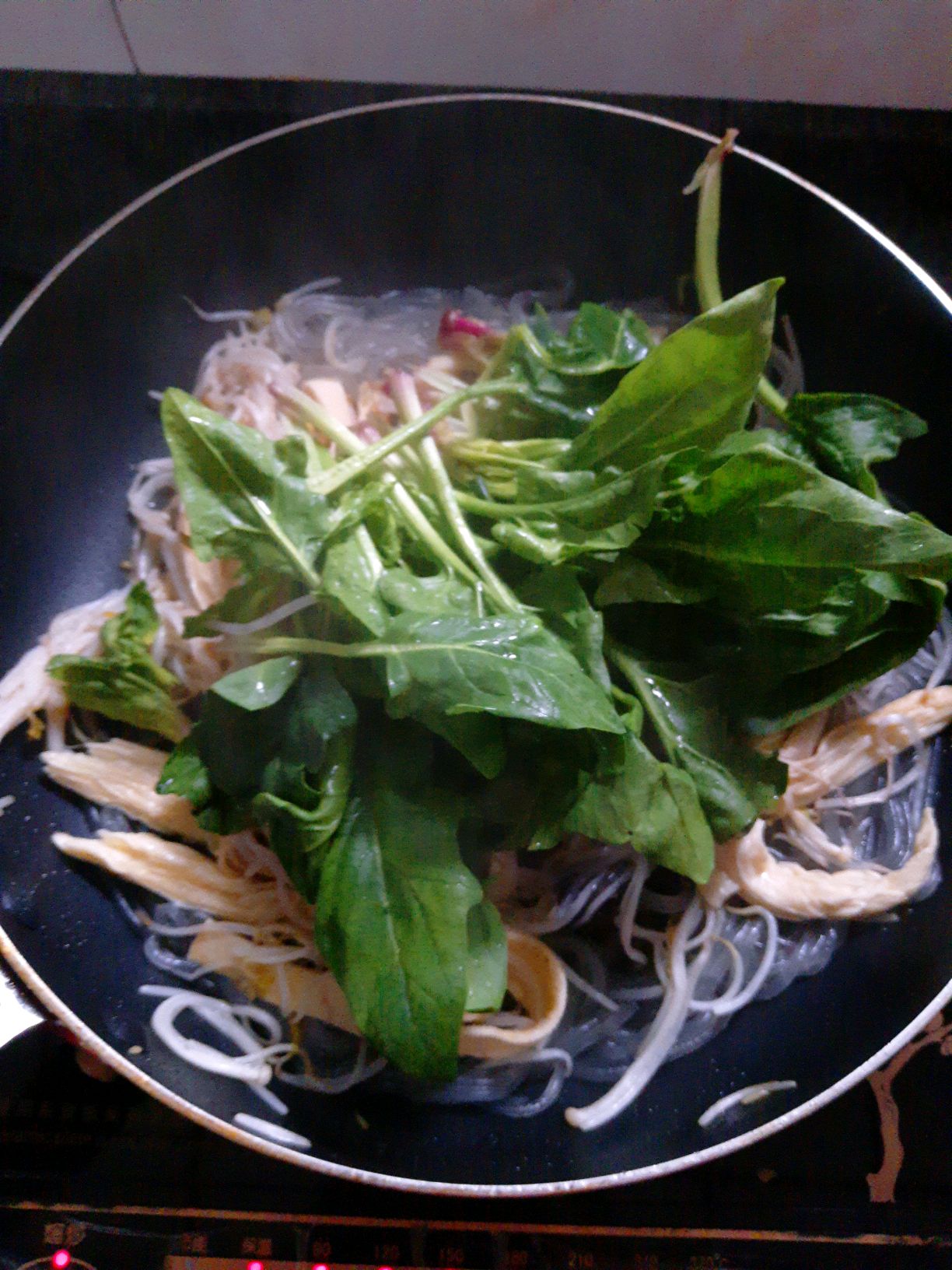 辅料:千张50克、豆芽50克、金针菇100克、菠菜1把、盐1克、老抽2ml、生抽3ml、太太乐鲍汁蚝油2ml
