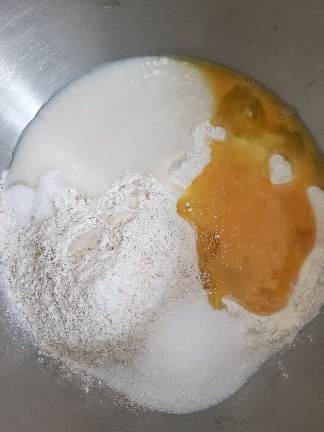 辅料:全麦粉50g、蛋液45克、牛奶80毫升、白砂糖15g、酵母粉2.5g、盐3g、无盐黄油15g、伯爵红茶包1.5包