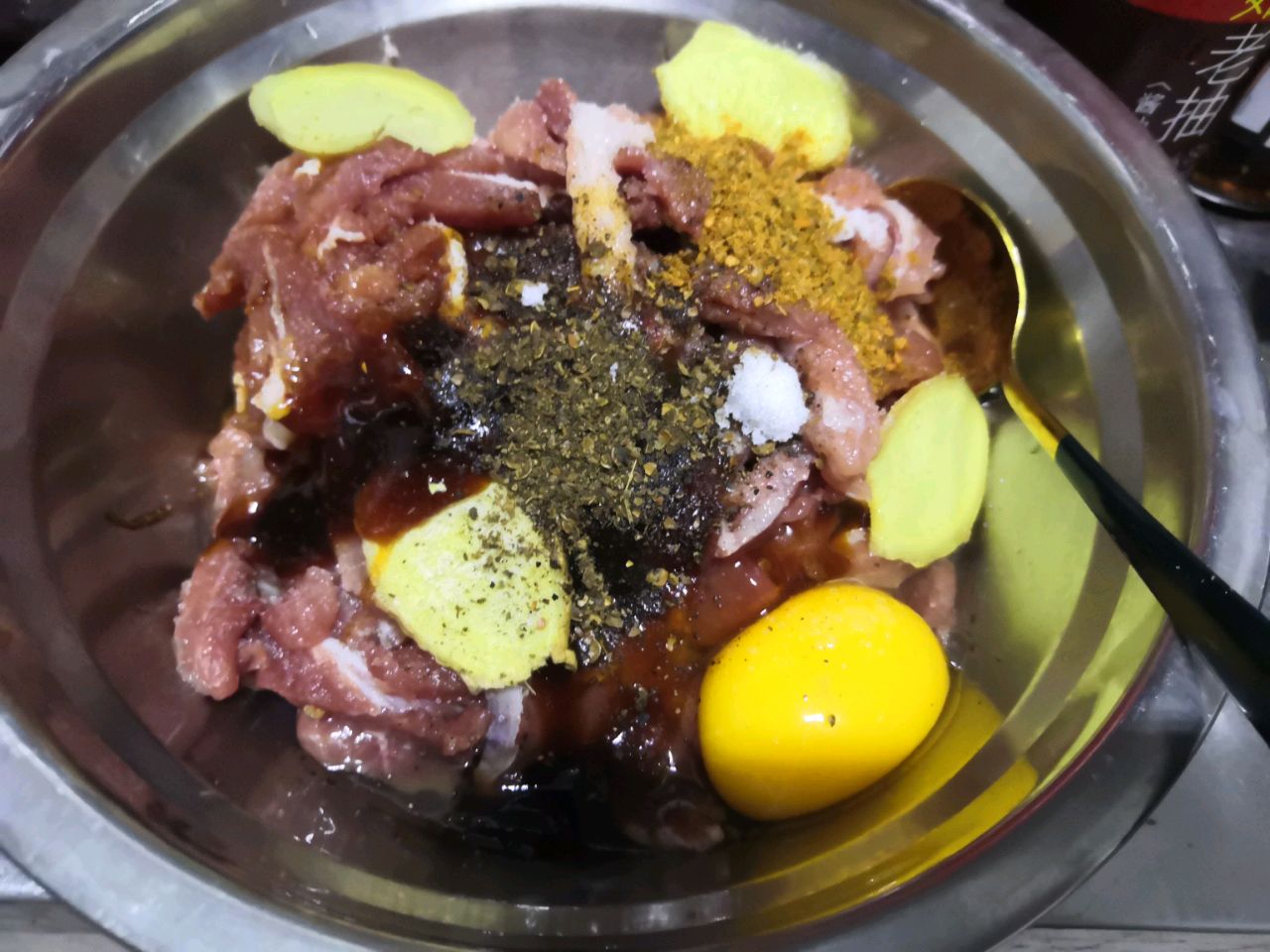 辅料:盐5g、白酒1.5瓶盖、花椒面5g、面粉50g、水适量、蚝油1勺、鸡蛋1个、酱油1瓶盖、烧烤粉1勺