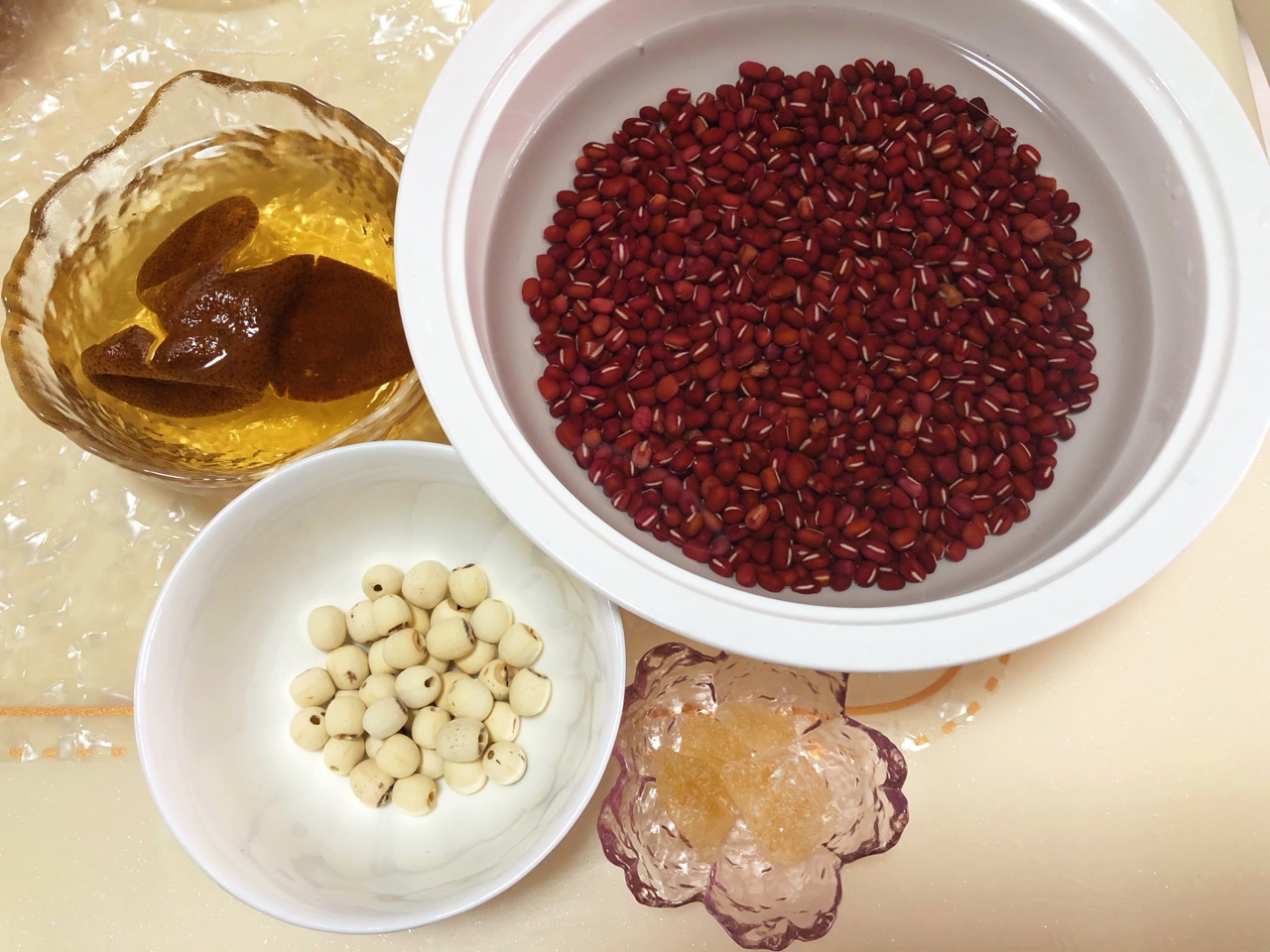 步骤1、红豆、陈皮冲洗干净,红豆净水浸泡一小时以上,陈皮用热水浸泡半小时以上,去芯莲子洗净备用。