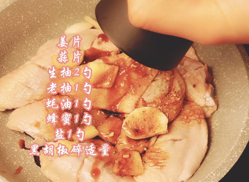 辅料:盐1勺、蚝油1勺、蒜片3瓣、姜片适量、生抽2勺、老抽1勺、蜂蜜1勺、黑胡椒碎适量