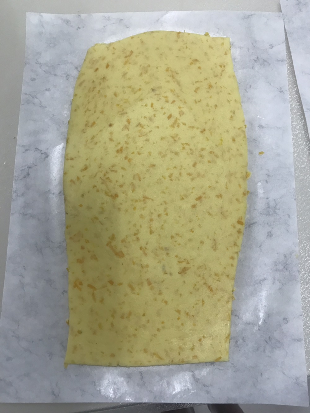 步骤8、两面用隔油纸,擀至大概0.4-0.5厘米厚,放入冰箱冷藏10分钟。