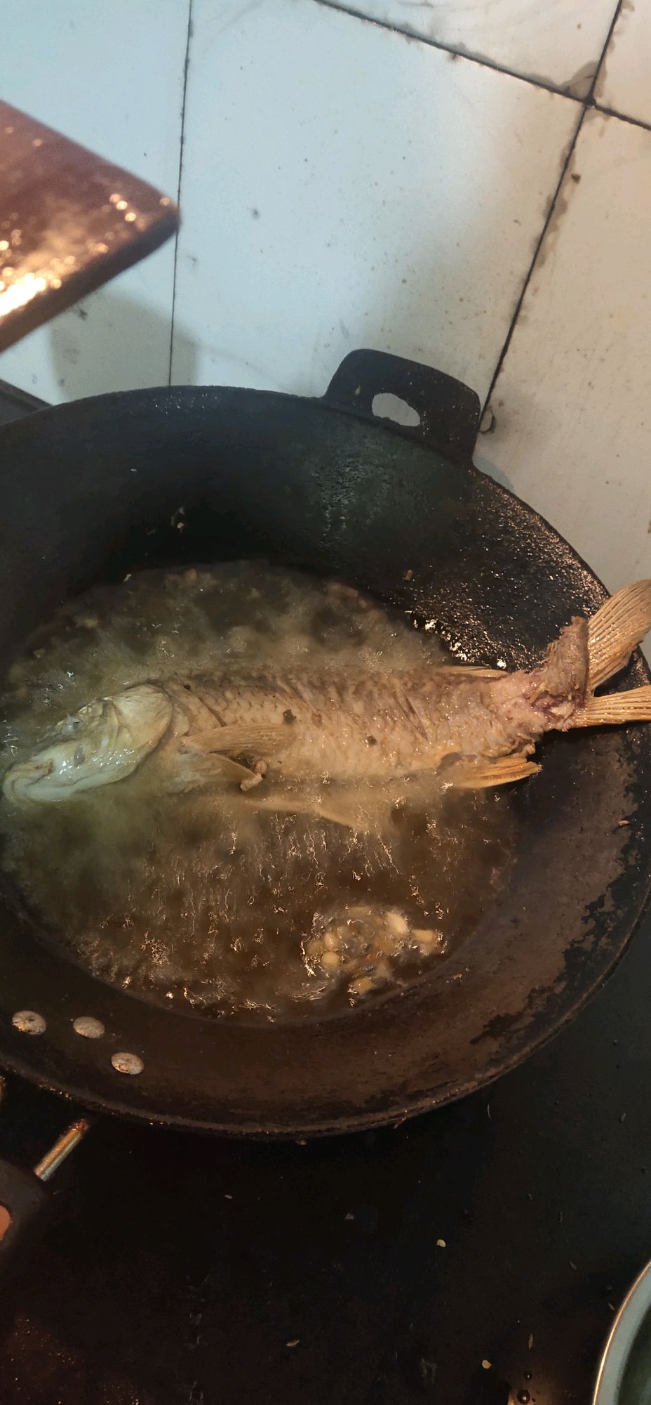 油不要太热那样容易糊 ;水要清理干净 不然容易溅油烫到自己 ;如果不想把鱼放进又捞出的话就适当的把他往上推 锅内留一点油,放葱姜蒜炸香就好那样就可以调汁啦!