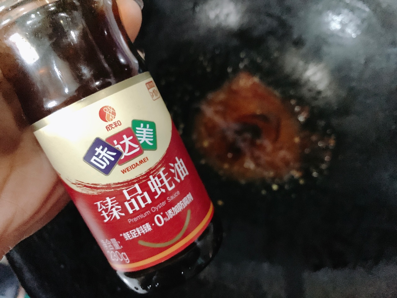 步骤17、适量蚝油,旺火炒至酱汁浓稠