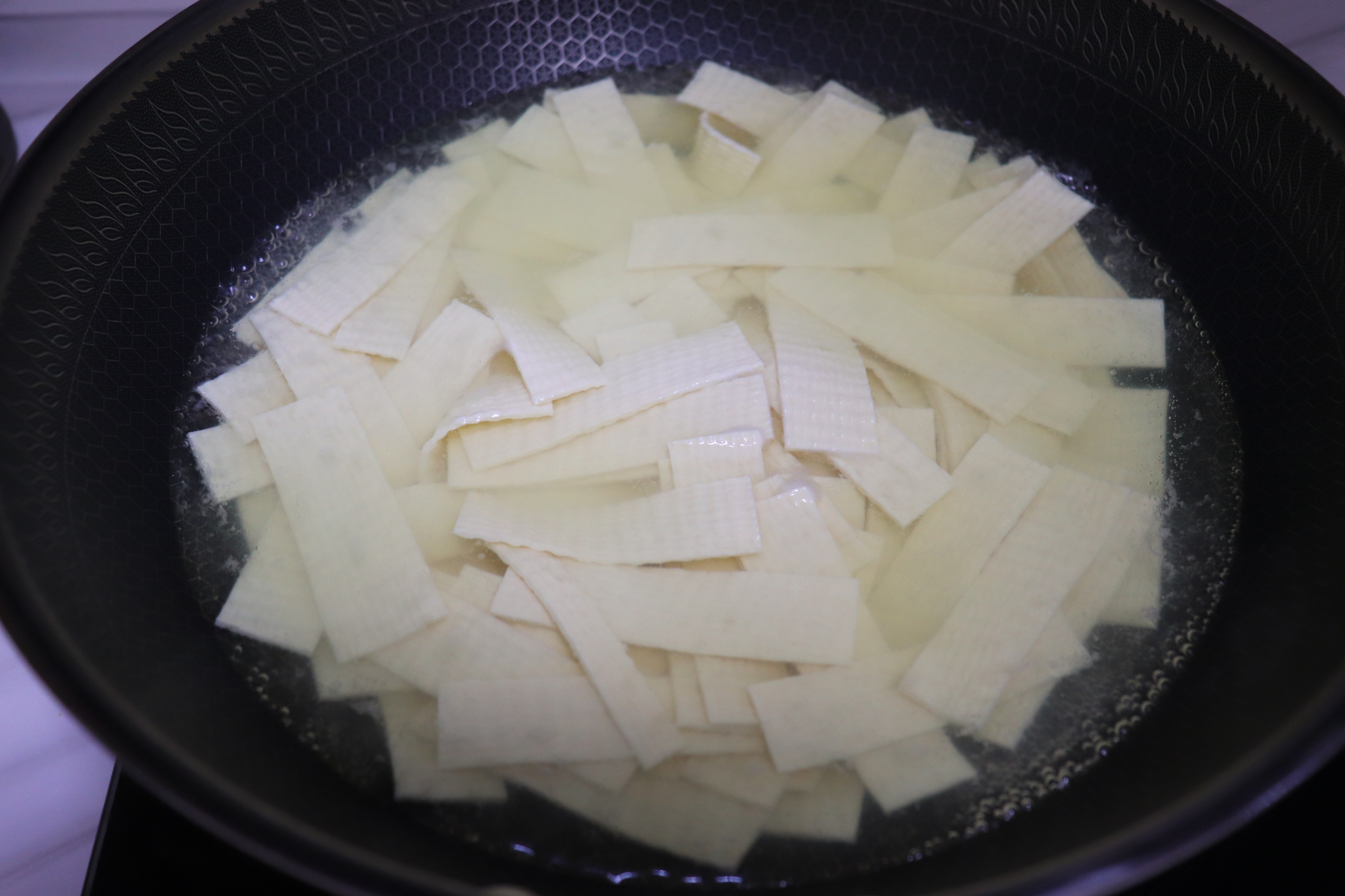 步骤3、豆腐皮放进锅里煮一分钟