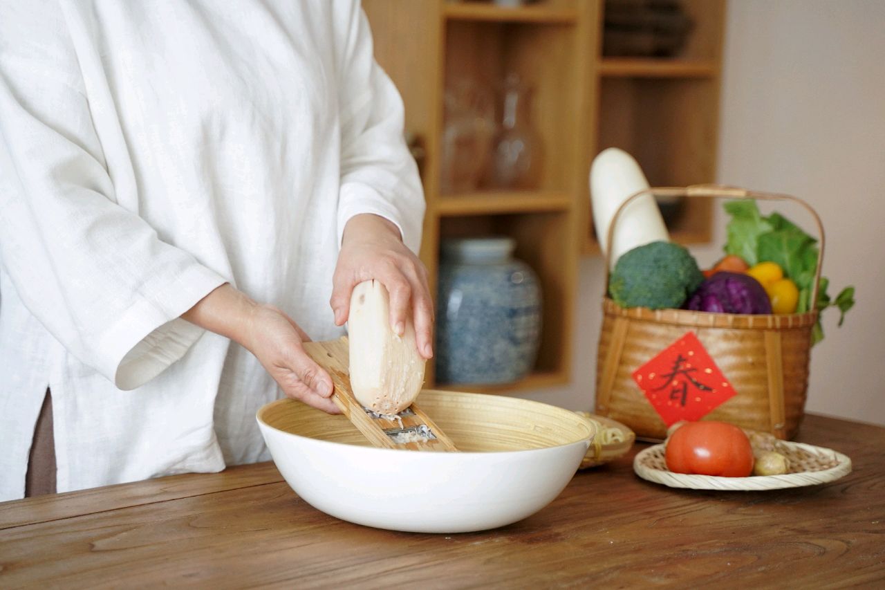 步骤1、鲜藕两节去皮,洗净,削薄丝;