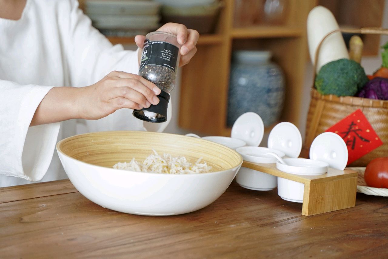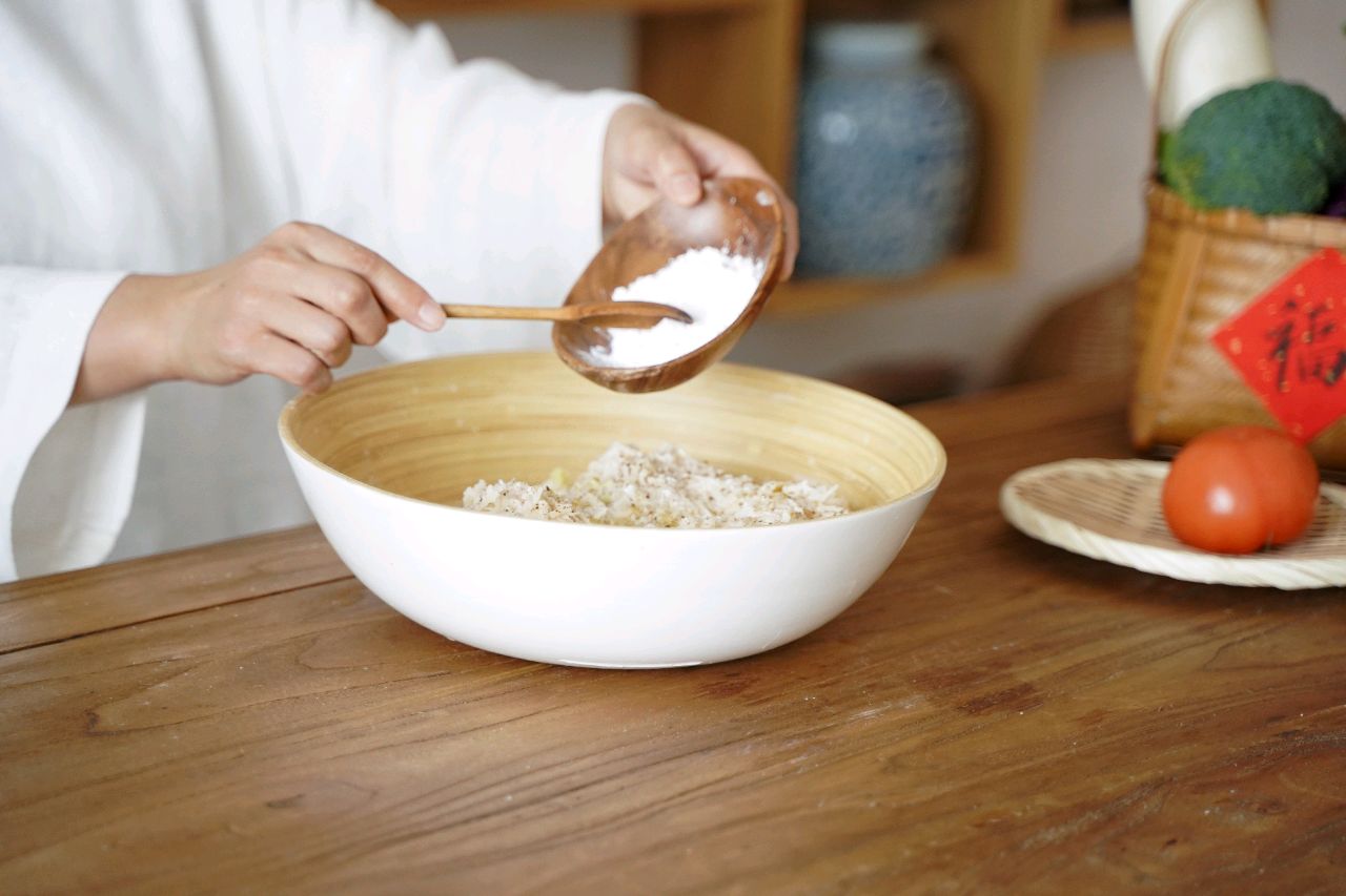 步骤2、放入果蔬粉、盐、黑胡椒粉调味;