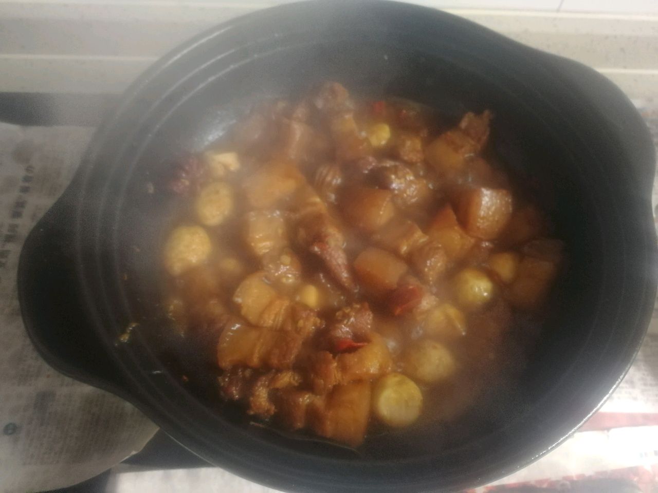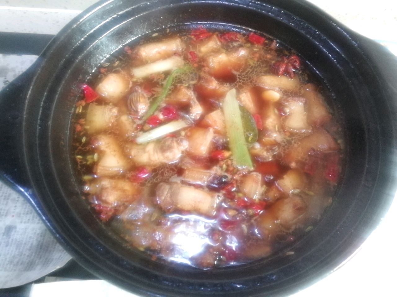 步骤10、倒入滚汤的热水没过五花肉,再倒入蚝油,中小火煮一小时左右