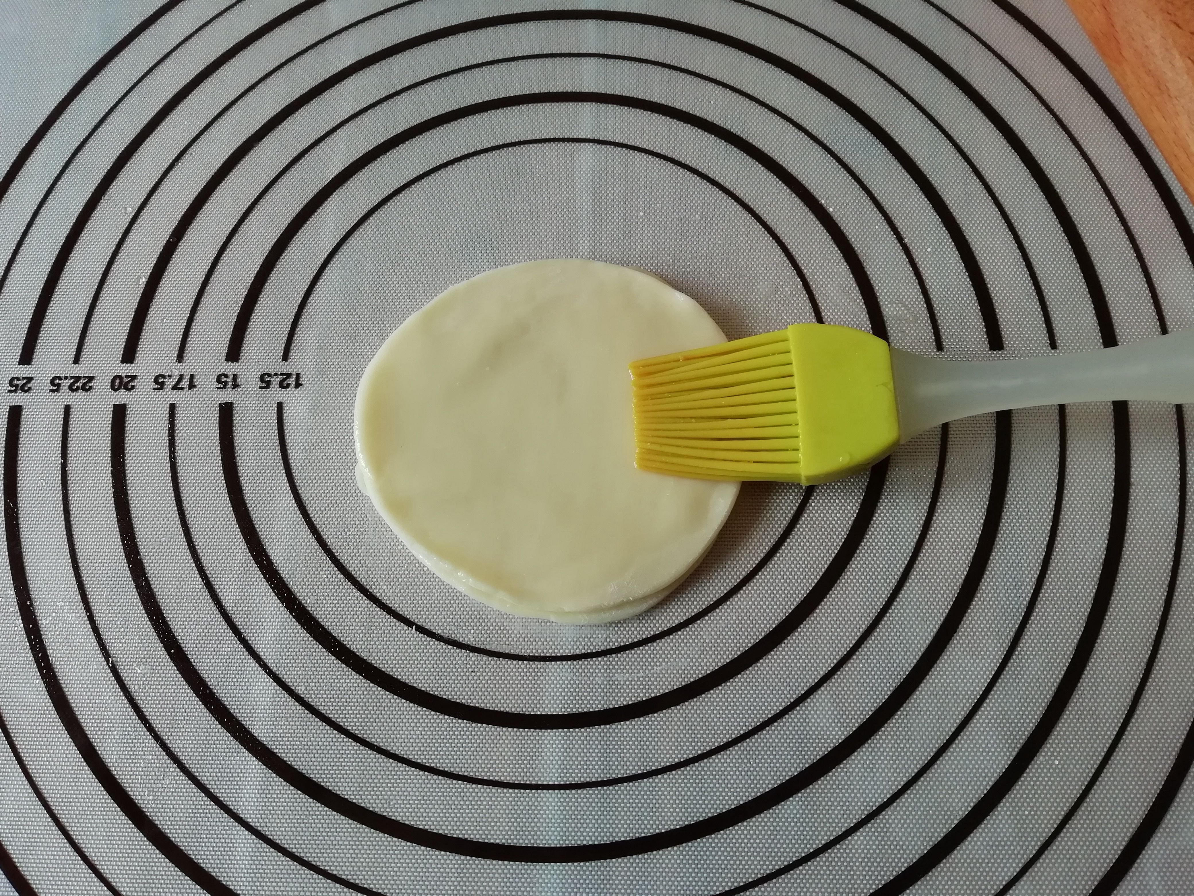 步骤2、取一张饺子皮,刷上少许花生油,再放上一张饺子皮,每一张都均匀地刷上花生油。
