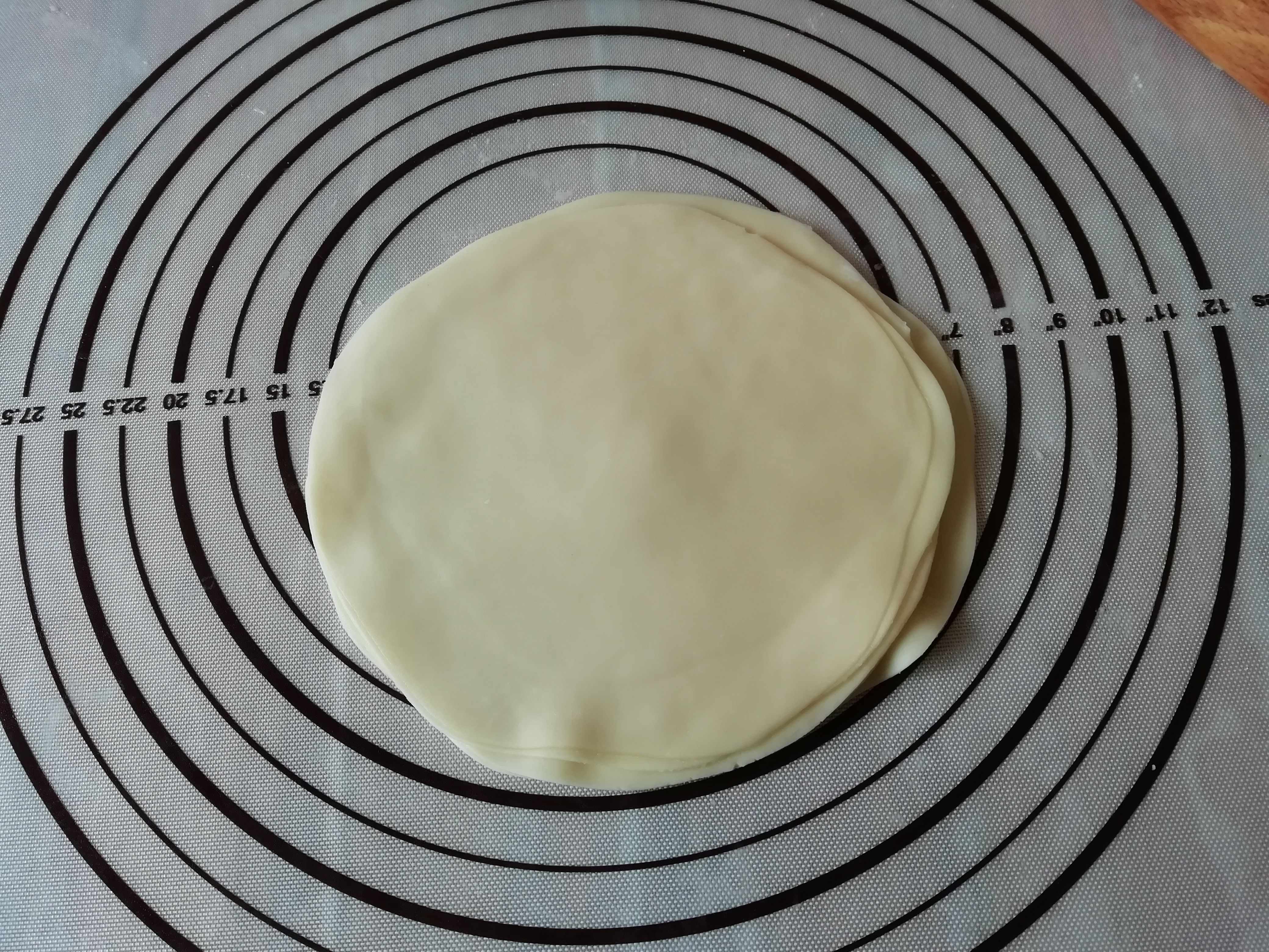 步骤3、五六张饺子皮叠加在一起,擀成薄薄的圆饼。盘子刷点油防粘,放入圆饼,冷水入锅,上汽后,大火蒸10分钟。