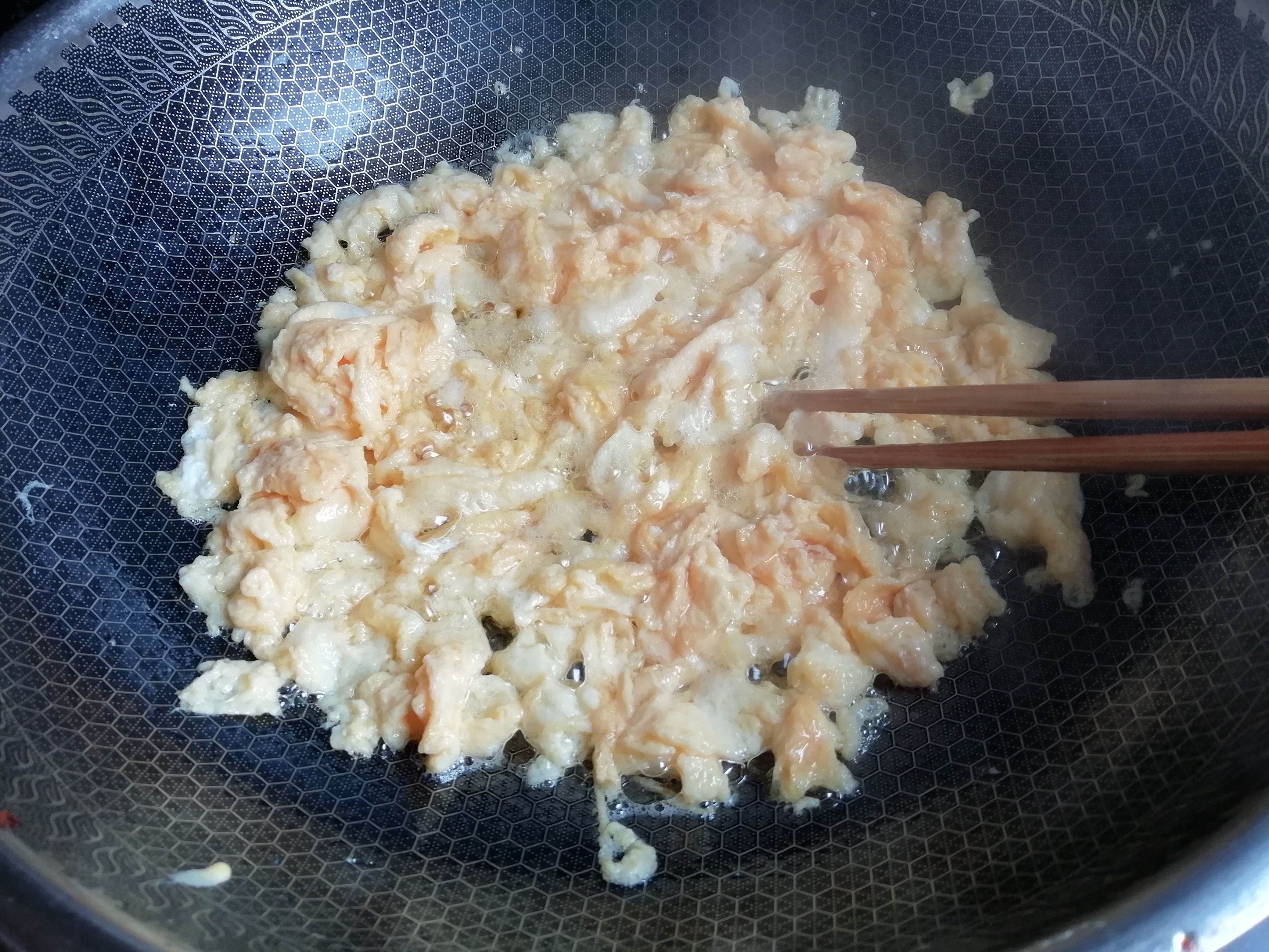 步骤6、热锅倒油,烧至九成热时,倒入打散的蛋液,用筷子划散,盛出。