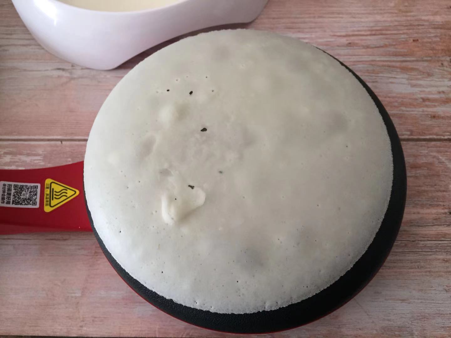 步骤4、把预热好的薄饼机的发热盘倒扣面糊中沾一下,停留1秒钟提起,翻转薄饼机静置加热约2分钟让面糊成熟,翻转薄饼机面饼自然脱落即表示成熟了