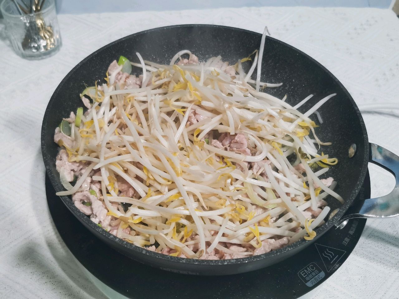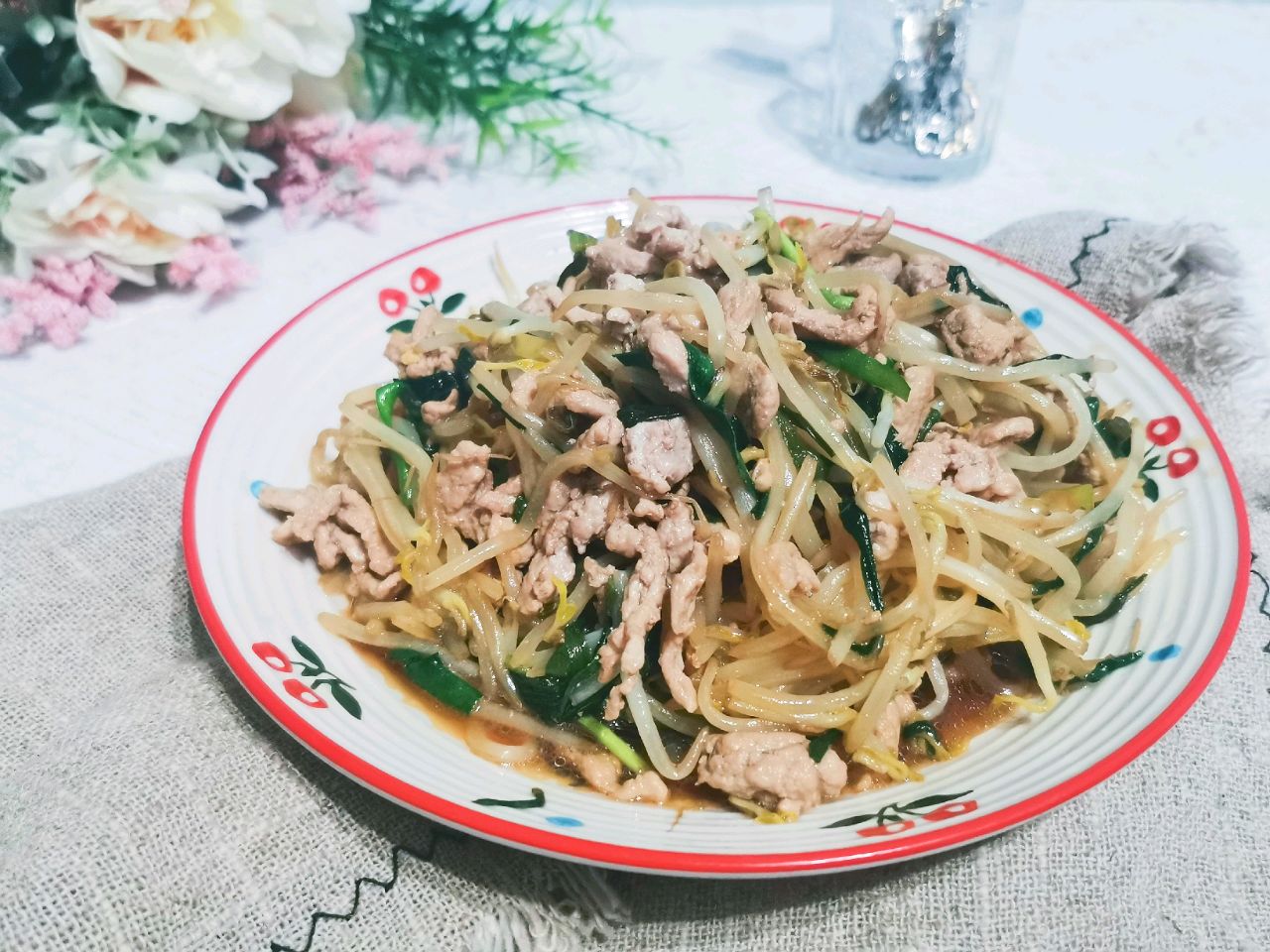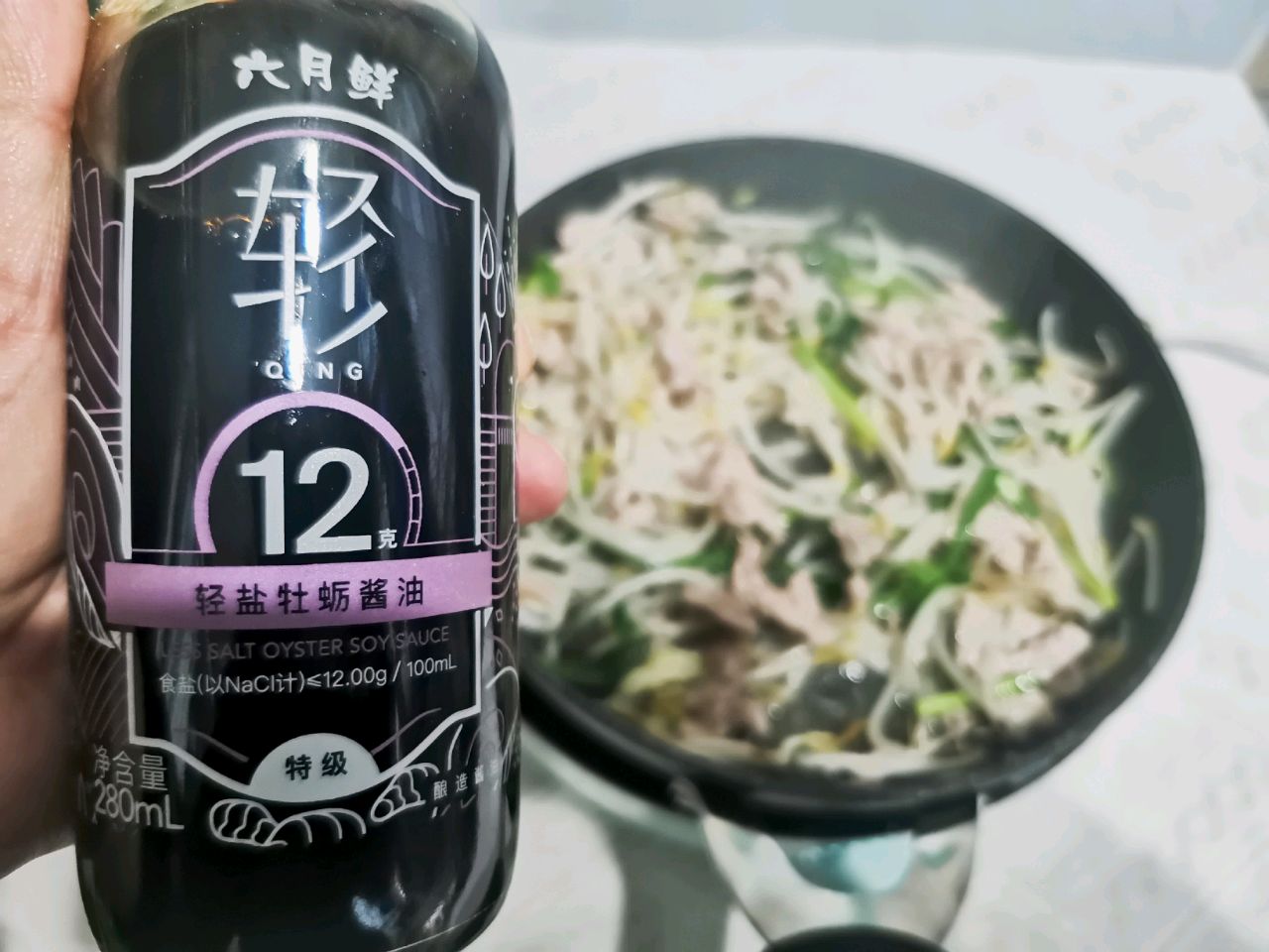 辅料:韭菜一把、豆芽500g、瘦肉300g、六月鲜12克轻盐牡蛎酱油1勺、味达美清香米醋半勺、大葱1段、香菇4朵