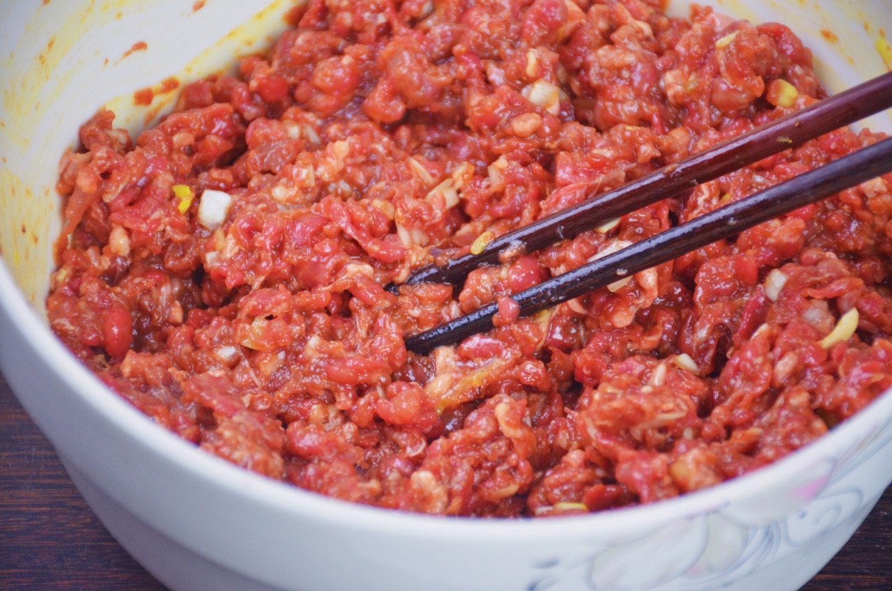 步骤2、用筷子沿着一个方向不停地搅拌均匀入味,直至牛肉馅上劲有黏性。