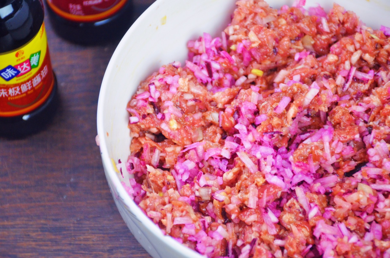 步骤1、牛肉用水清洗干净,用绞肉机打成自己需要的颗粒状,大葱一段切成葱碎,姜切成姜末,里面加入胡椒粉和花椒粉各1匙,味达美酱油1匙用来上色入味,味达美味极鲜酱油用来提鲜,花生油和盐,一起混入馅中。
