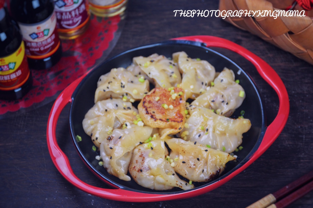 步骤6、平底锅刷油,油热后将水饺放入,中火慢煎至底部定型成金黄色,再加入半碗清水,盖上锅盖中火煎至水分收干,听到锅中劈劈啪啪的声音,开盖撒上小葱碎和黑芝麻。