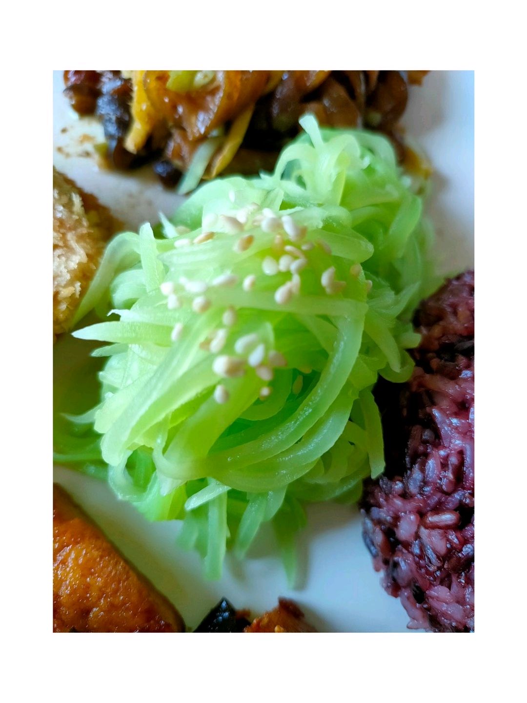 步骤4、净炒莴笋——热锅油,放莴笋丝,用刨丝器,加盐,过程超简单,炒出来好美,又柔软清爽,放白芝麻装饰。