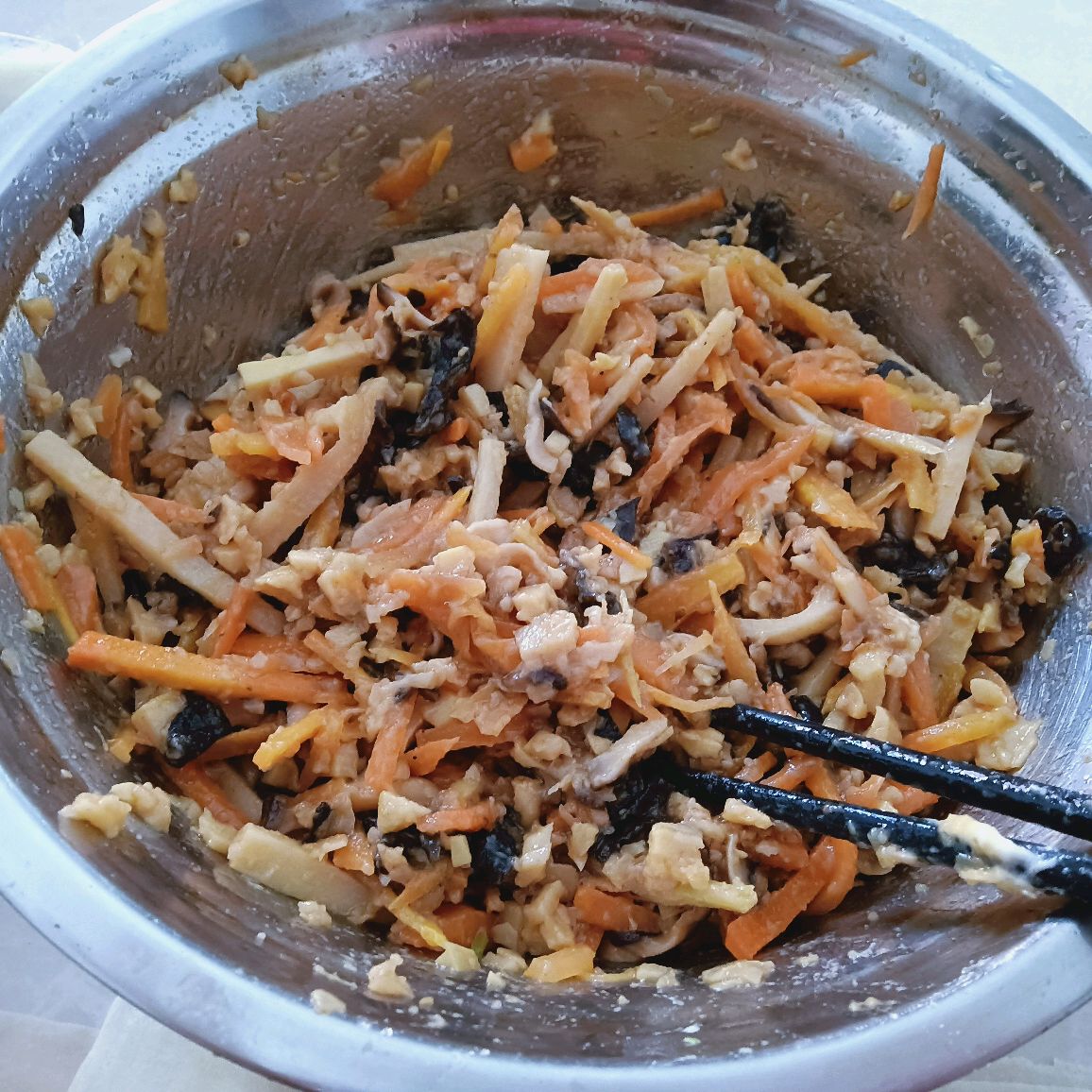 辅料:冬笋适量、木耳适量、香菇一点点提香