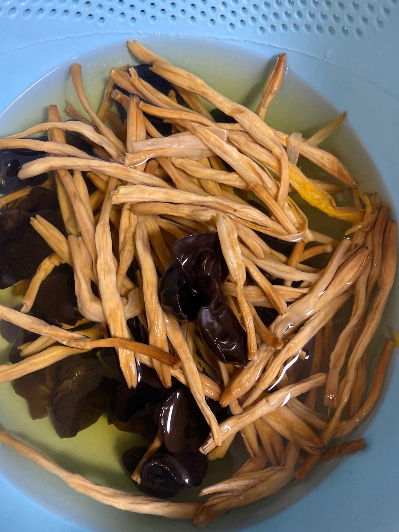 步骤2、黑木耳黄花菜泡发备用(黄花菜一丢丢就可以,我这个加多了)
