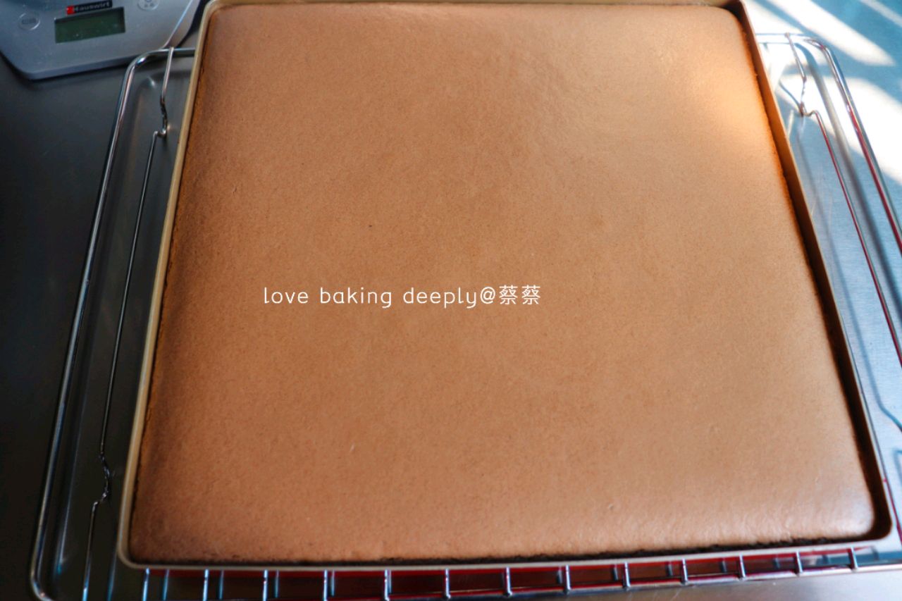 步骤14、出炉之后美美的毛巾底~蛋糕卷还有一点点余温的时候就可以卷了,如果说放上奶油厚了不会卷的新手朋友们就可以把裸蛋糕卷先卷起来,放入冰箱15分钟,等奶油操作好再打开来夹上奶油就会比较好卷。当然了,如果是经常做会卷的就可以不用先定型。