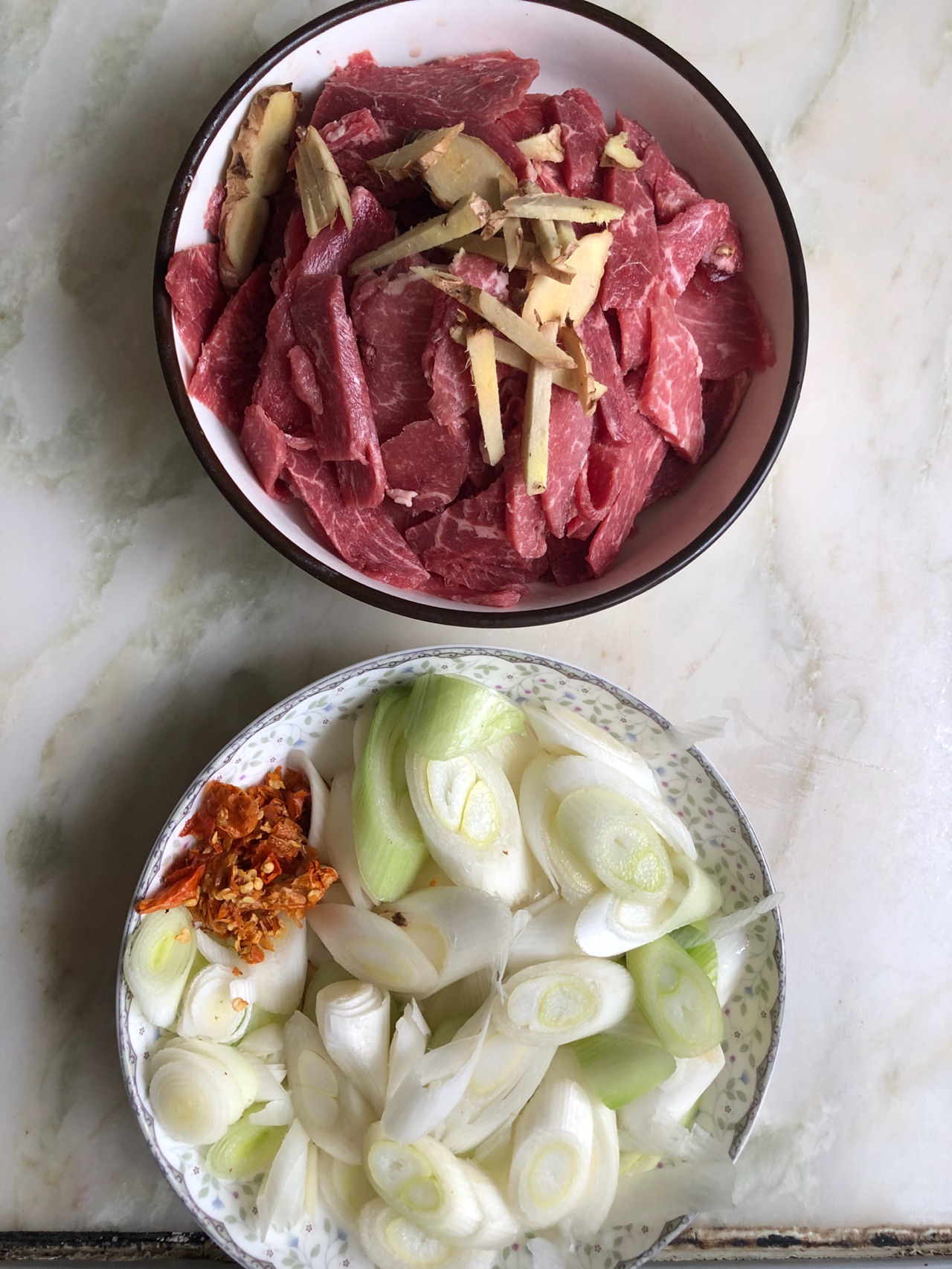 步骤1、将驴肉切成薄片,大葱切成马耳状