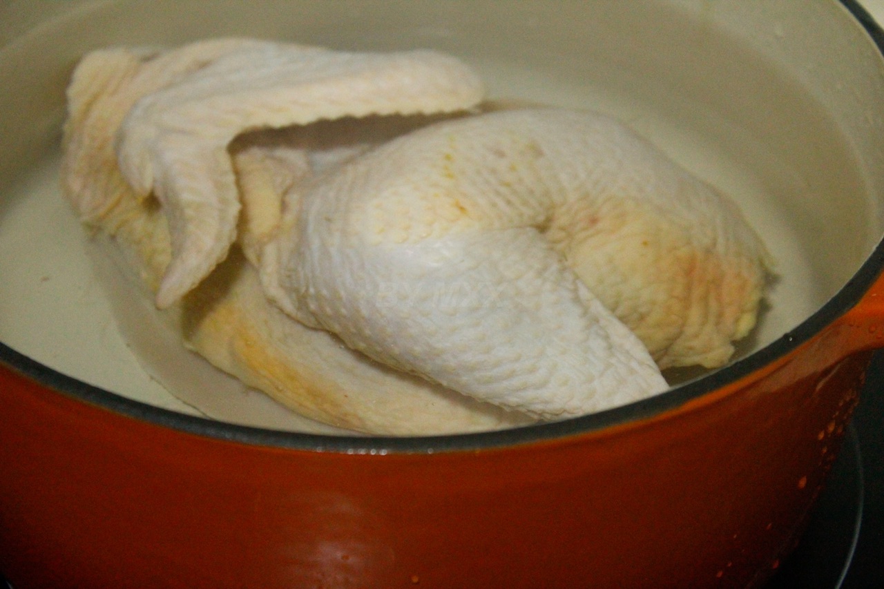 步骤6、煮好的鸡肉捞出置事先准备好的冰水中浸泡30分钟;