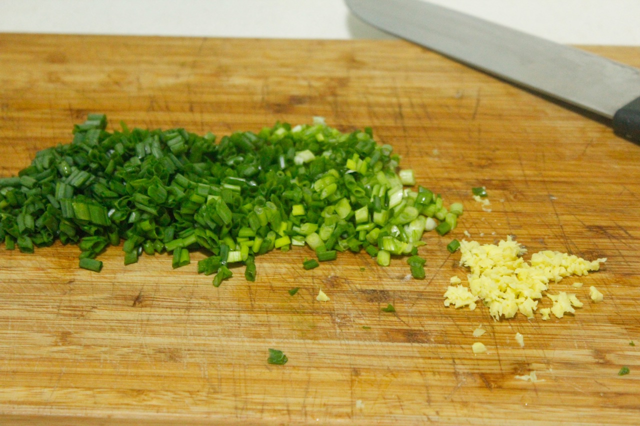 步骤7、浸鸡的时候将剩下的小葱、姜分别切细末;切好的葱白粒和葱绿粒分开放。