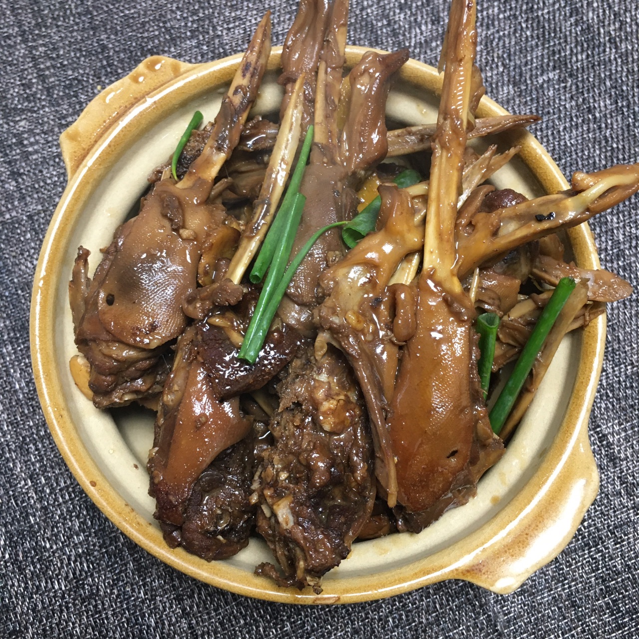 步骤4、4⃣️然后将鸭下巴也放进锅里爆香,加上盐、生抽、陈醋、糖和水,加的水要没过鸭子,大火焖十分钟后转小火焖三十分左右。