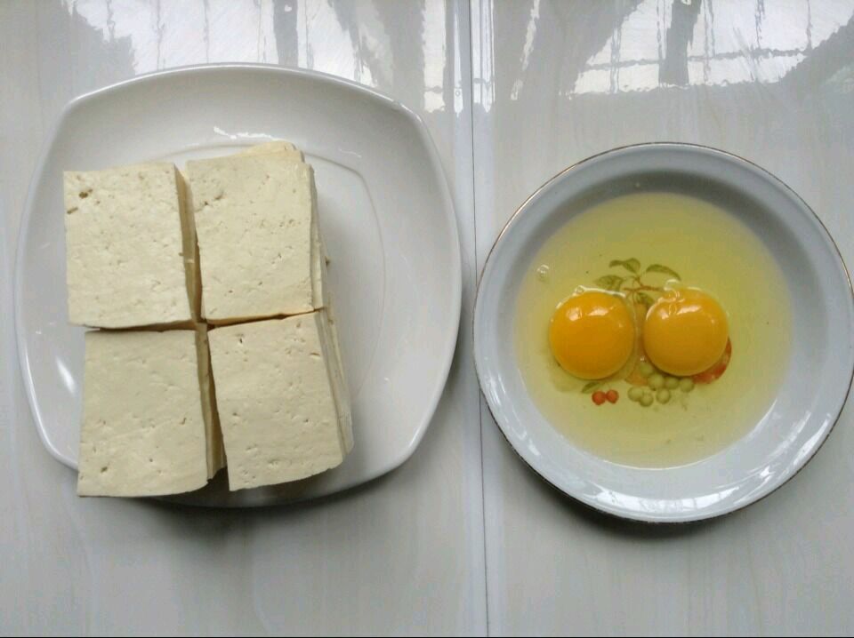 步骤2、先把豆腐切成大块,再把鸡蛋打入盘中