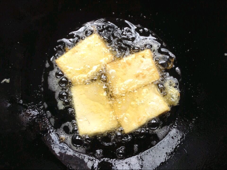 步骤8、锅中豆腐块上的蛋液炸至凝固时,用铲子把豆腐块翻面再炸,炸至两面金黄外壳香脆时,捞出控干热油,整齐的放入菜盘中,全部炸完装盘后,用勺子舀起一些番茄酱,淋入炸黄的豆腐块上(也可将番茄酱装入小碗中,边蘸边食),一盘美食,鲜香四溢。