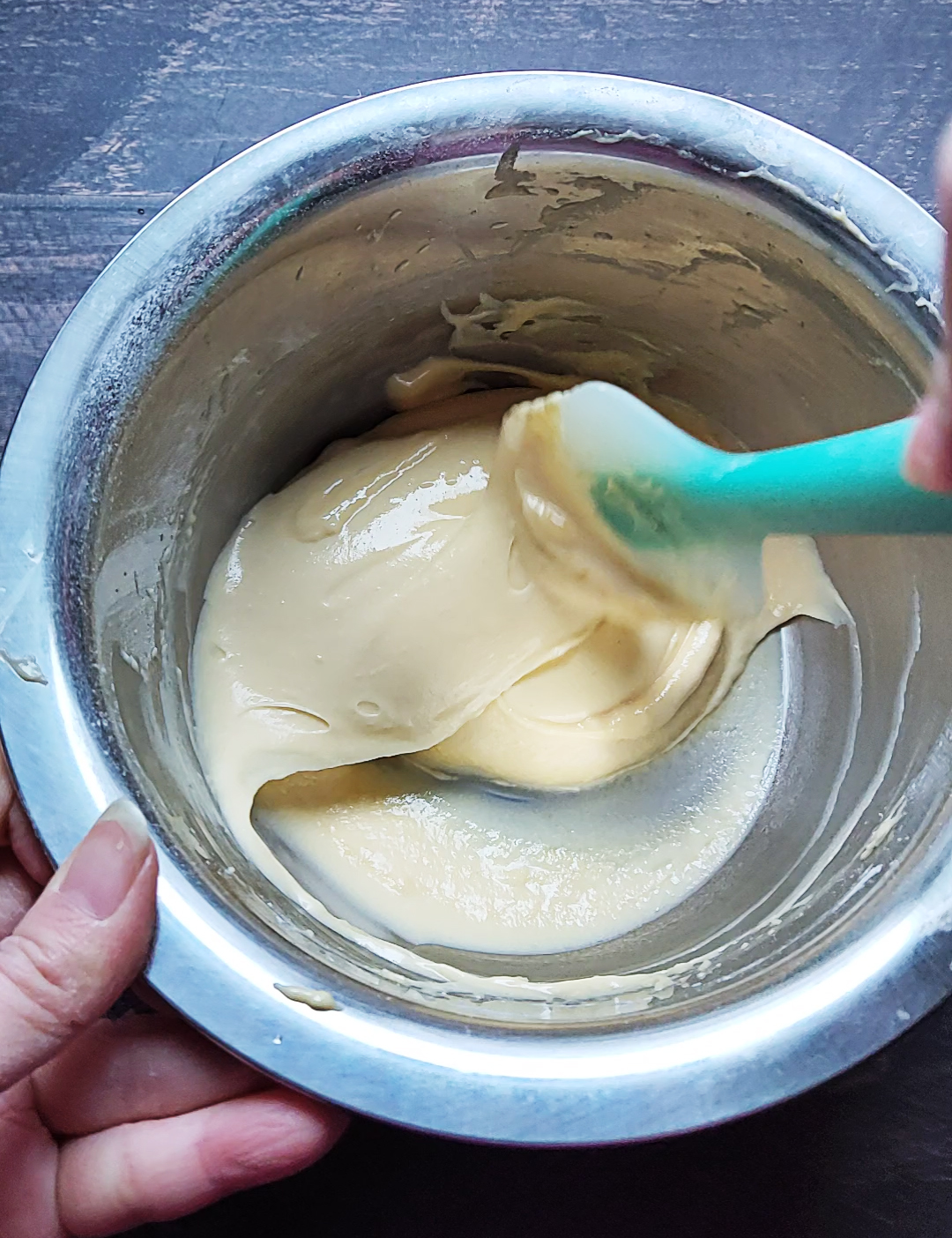 步骤5、将前面打好的蛋白糊加入,J字形翻拌均匀,这个和烤蛋糕的翻拌手法一样。