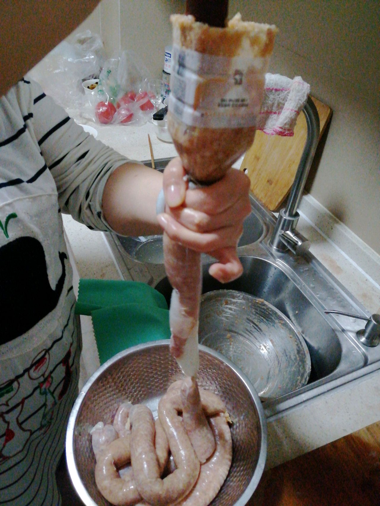 步骤7、提前把肠衣用水清洗,然后用料酒泡上半个小时。自制简易灌肠器,也可提前网上购买,一次不要加入太多肉馅也不要太大力气免得把肠衣弄破。