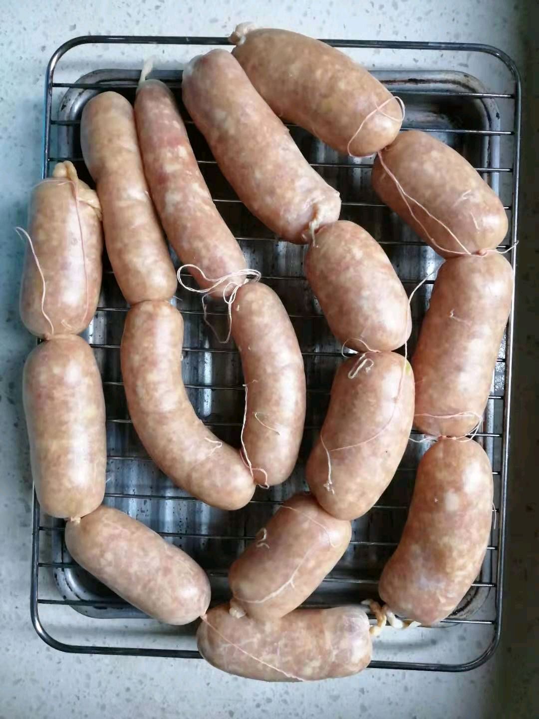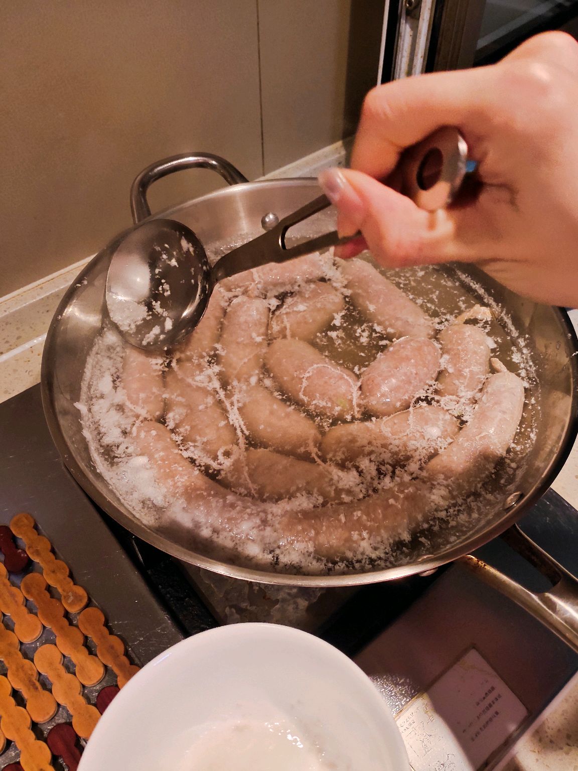 步骤9、晾晒表皮风干水份,做水煮。一定用中小火,水将将要开的状态,否则容易把肠煮破,期间有浮沫一定要舀出去,大概煮半个小时。