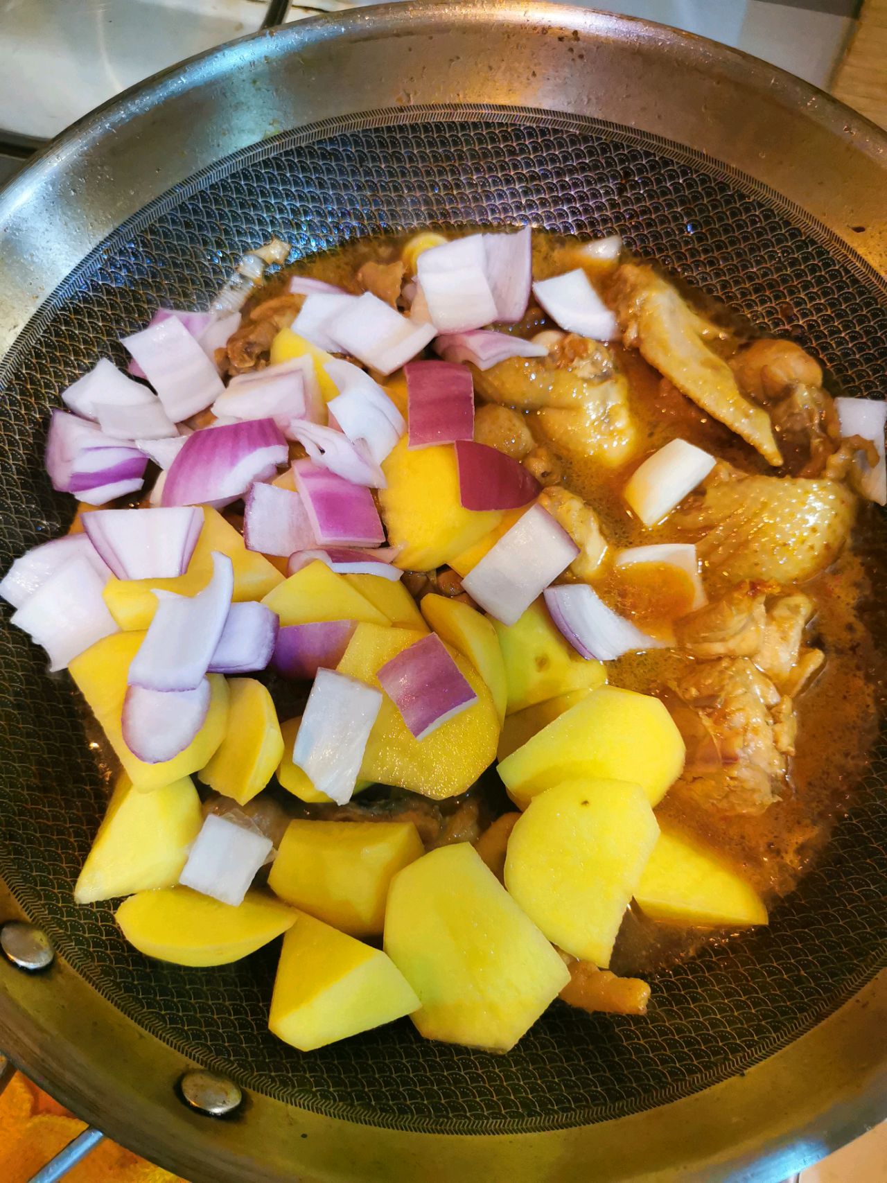 辅料:土豆2个、洋葱半个、盐少许、生抽2勺、八角1个、老抽1勺、香叶2片、料酒2勺、蒜头2瓣、白糖2勺、生姜1块