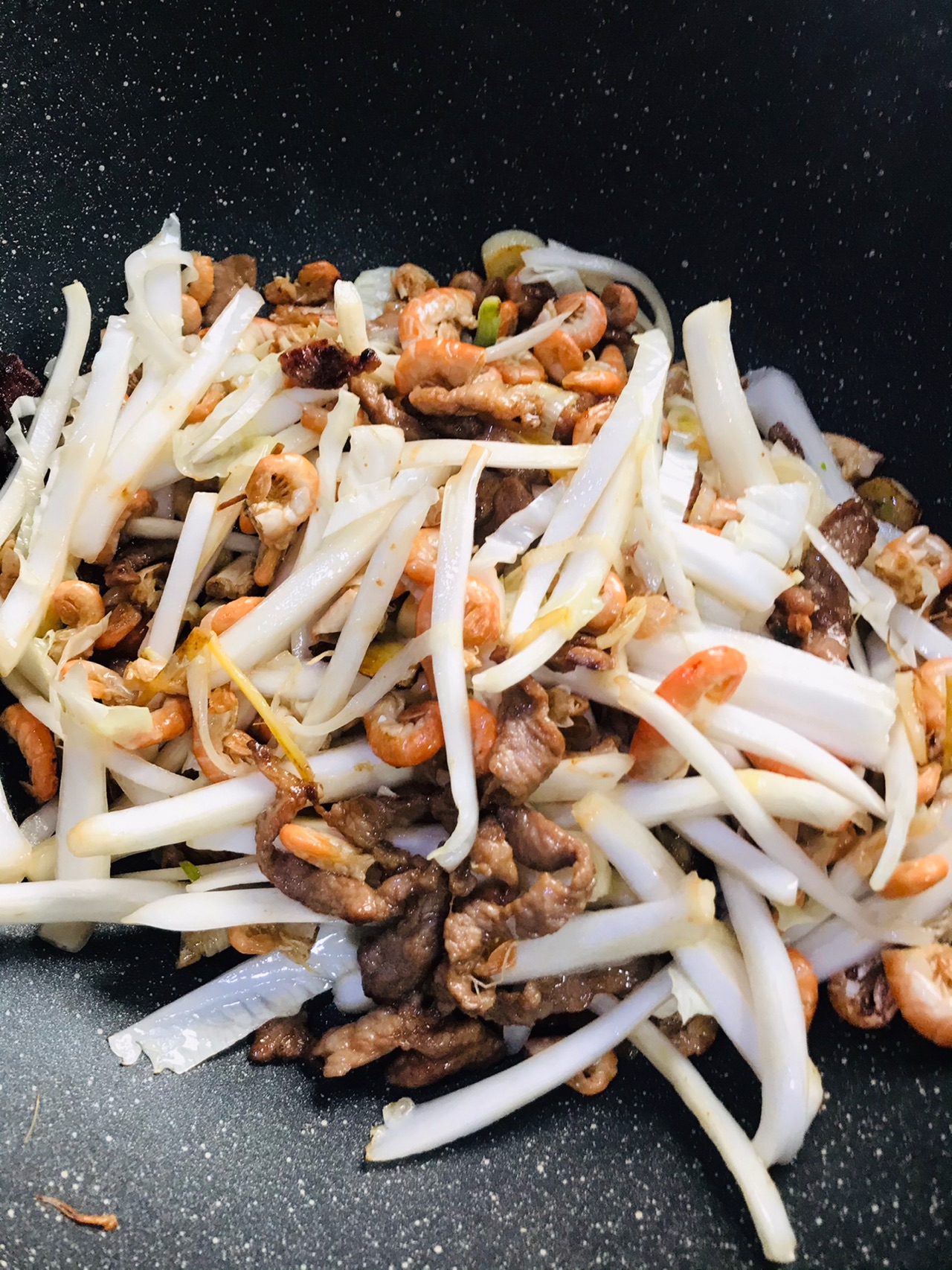 步骤7、开锅后放入白菜叶翻炒均匀,煮至沸腾翻炒均匀。勾芡调味出锅!