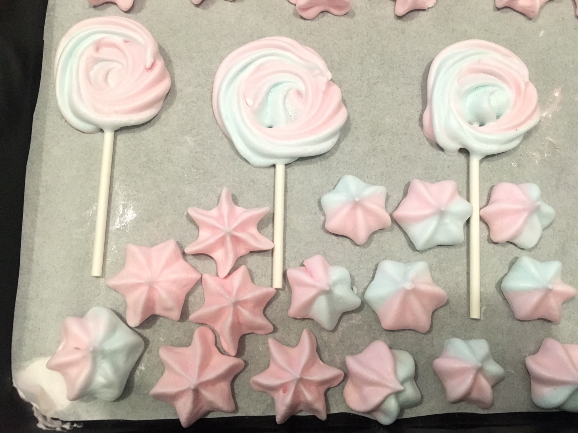 步骤8、做蛋白霜棒棒糖的话,需要在棍上粘蛋白固定在油纸上,然后再挤出你喜欢的款式。风炉模式上下火90度烤2小时,放中下层。