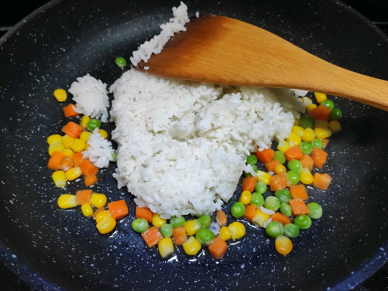 步骤3、准备一把综合蔬菜粒,下油锅翻炒。我是用超市里卖的综合蔬菜粒,有玉米,胡萝卜,青豆,大家也可以根据自己的喜好来安排。