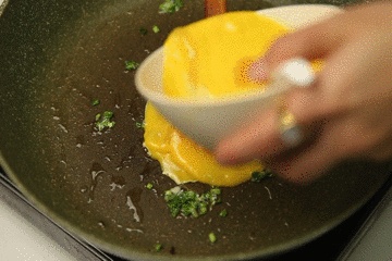 步骤4、炒蛋——在油冒烟后、能闻到煸炒出的葱香时,就边倒 2/3 那份蛋液,边用锅铲快速搅拌,以免蛋液凝结成块。或扬州炒饭版:宽油下蛋液,用筷子快速旋转,将鸡蛋划成细碎的丝絮。