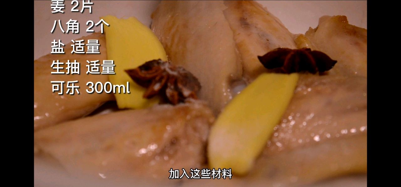 辅料:姜2片(焯水用)、八角2个、盐适量、姜2片、生抽适量、可乐300毫升