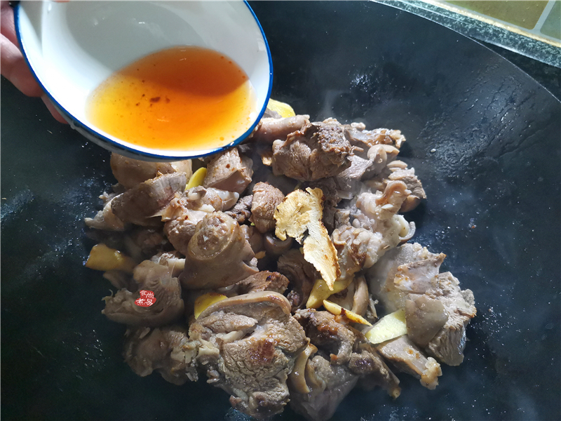 步骤6、淋入料酒,放入当归、陈皮、冰糖、鸡粉,翻炒至酱汁裹满羊肉;