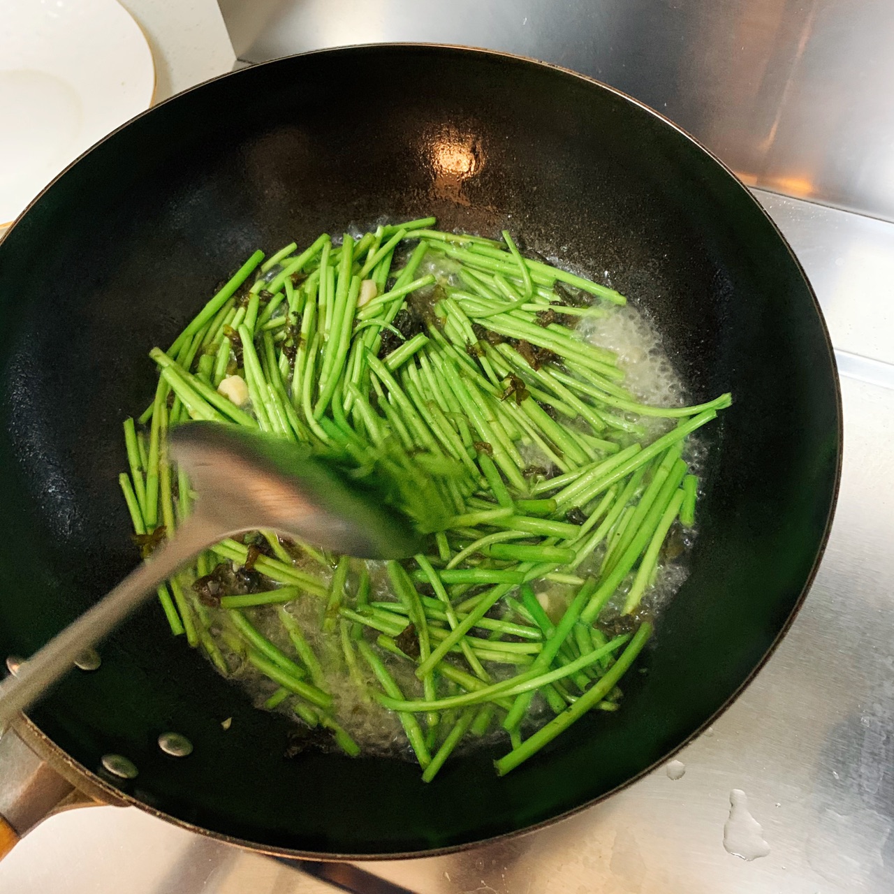 步骤2、Ⅰ热油,炒香蒜Ⅱ下茼蒿炒出水,再加入地皮菜翻炒。最后加一点水和盐煮3min收汁即可