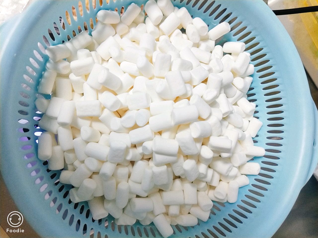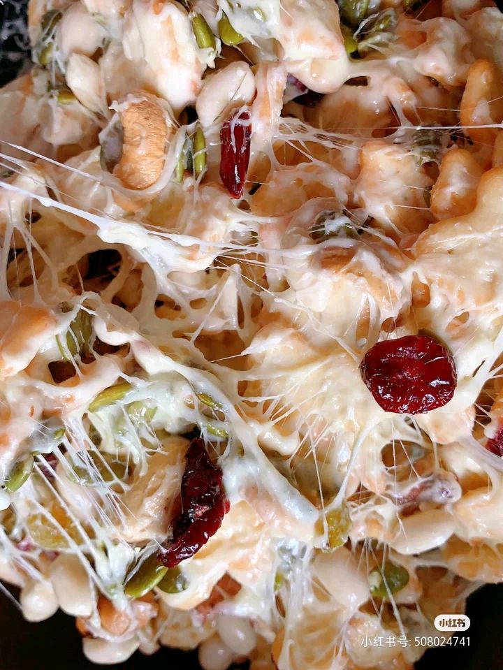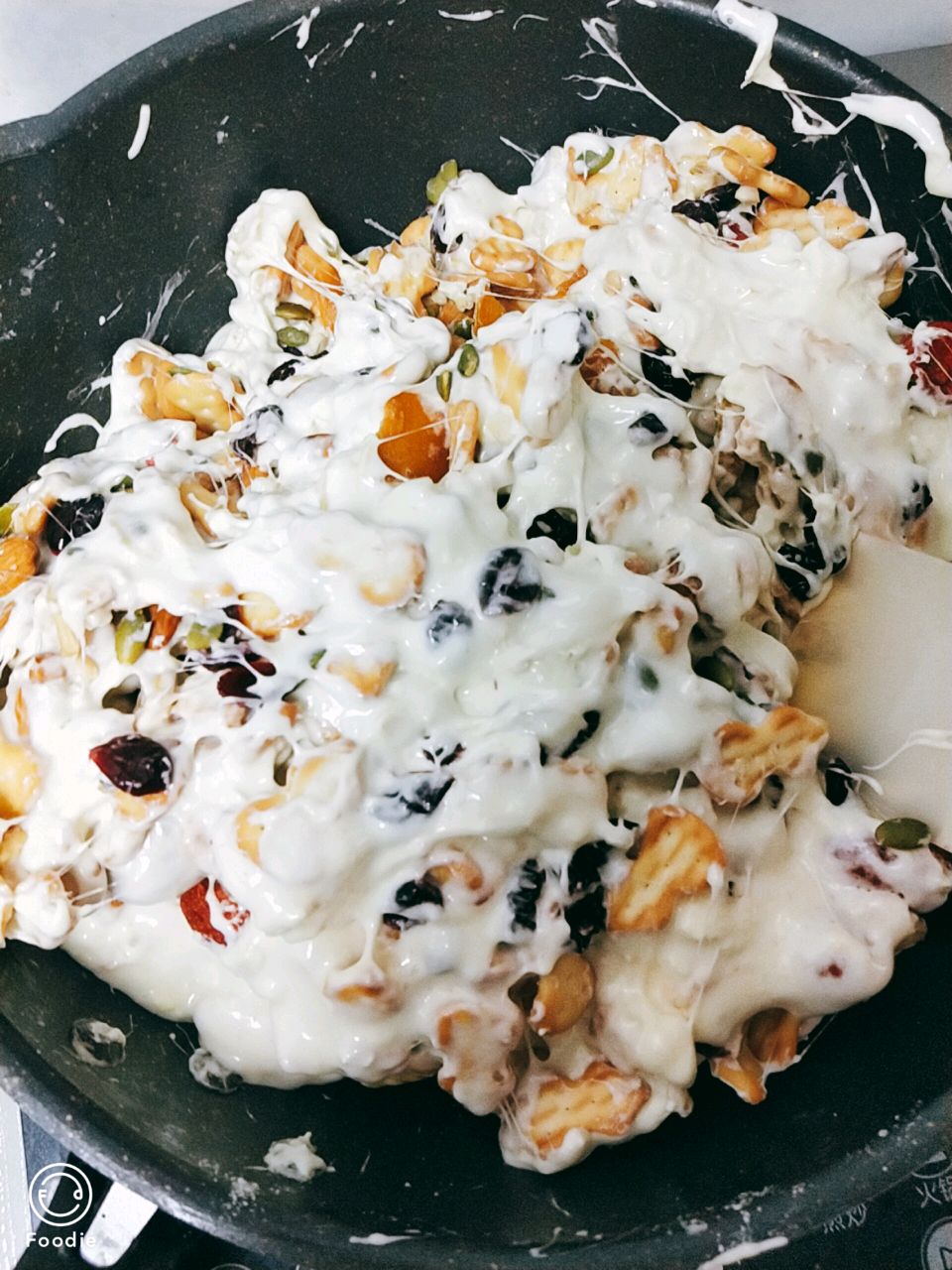 步骤4、等棉花糖炒制云朵状态后加入奶粉快速炒制拌匀立马关火然后加入所以食材拌匀。千万不能一直开着火会越炒越硬。