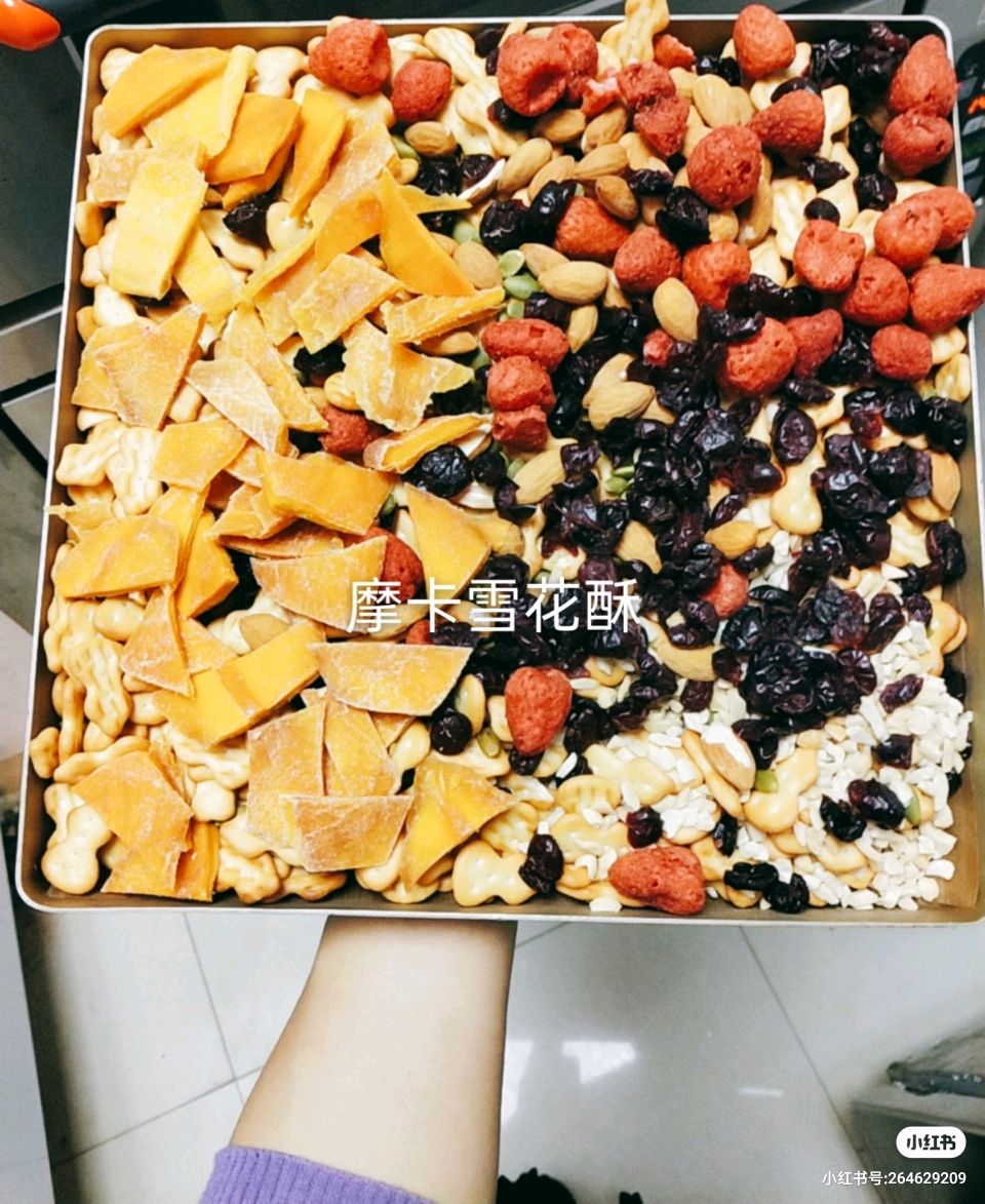 步骤3、把小饼干,蔓越莓干,芒果干,坚果全部放在一起,天冷可以开烤箱160度关火后放进去保温待用。