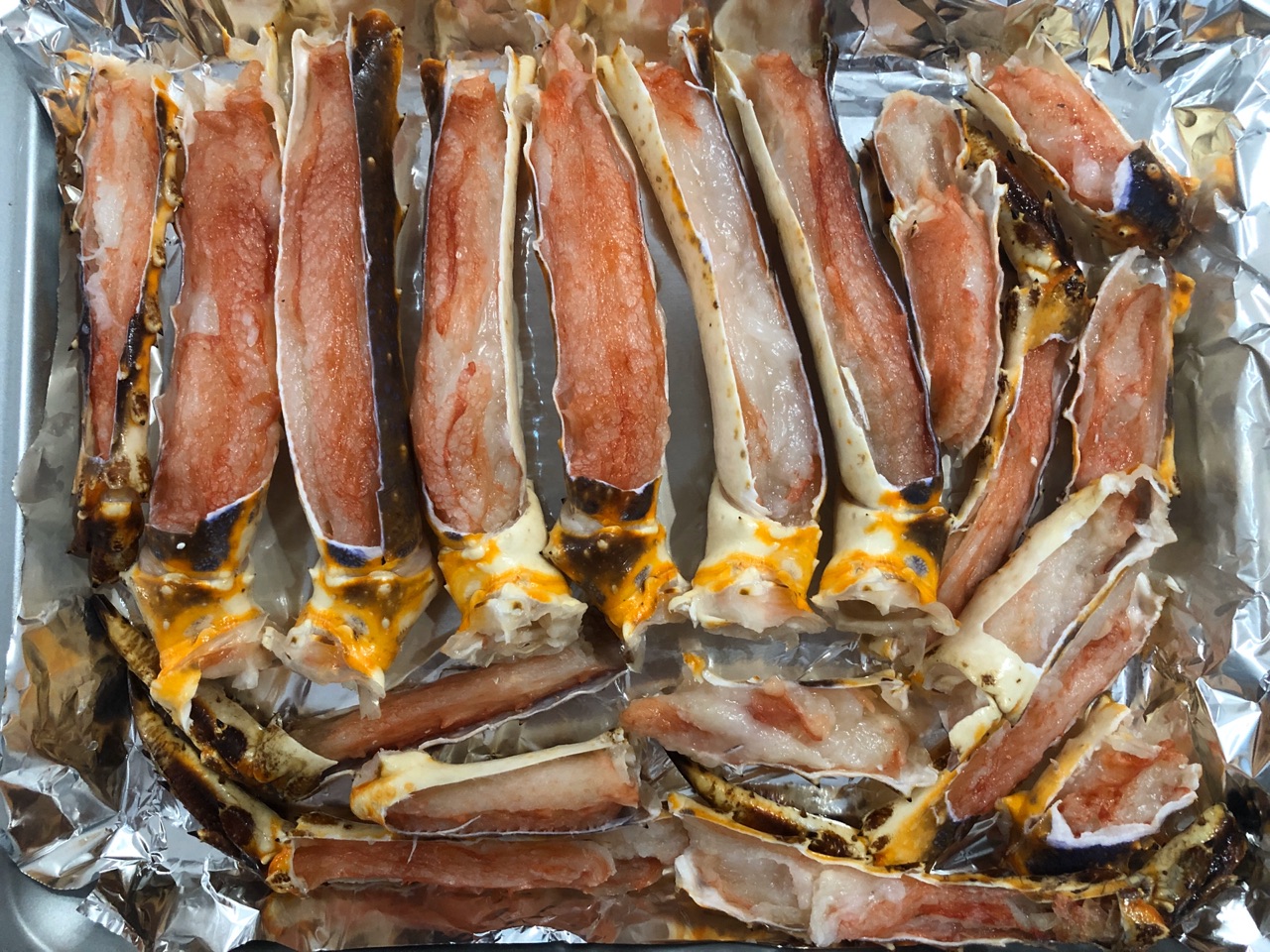 步骤2、把每只蟹腿壳都剪掉一半。这是处理好了,摆在烤盘锡纸上的样子