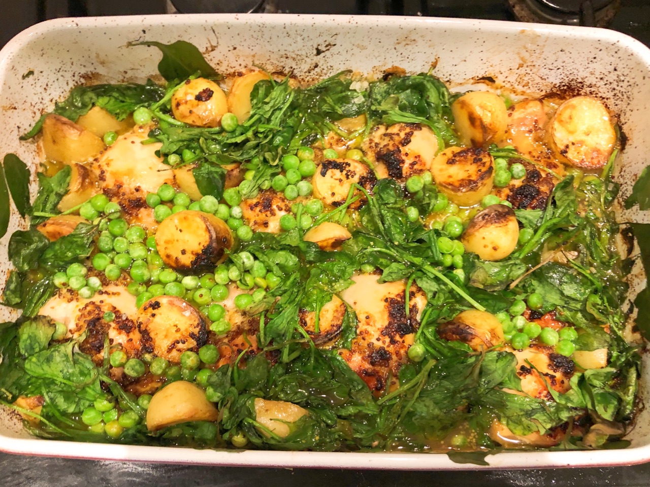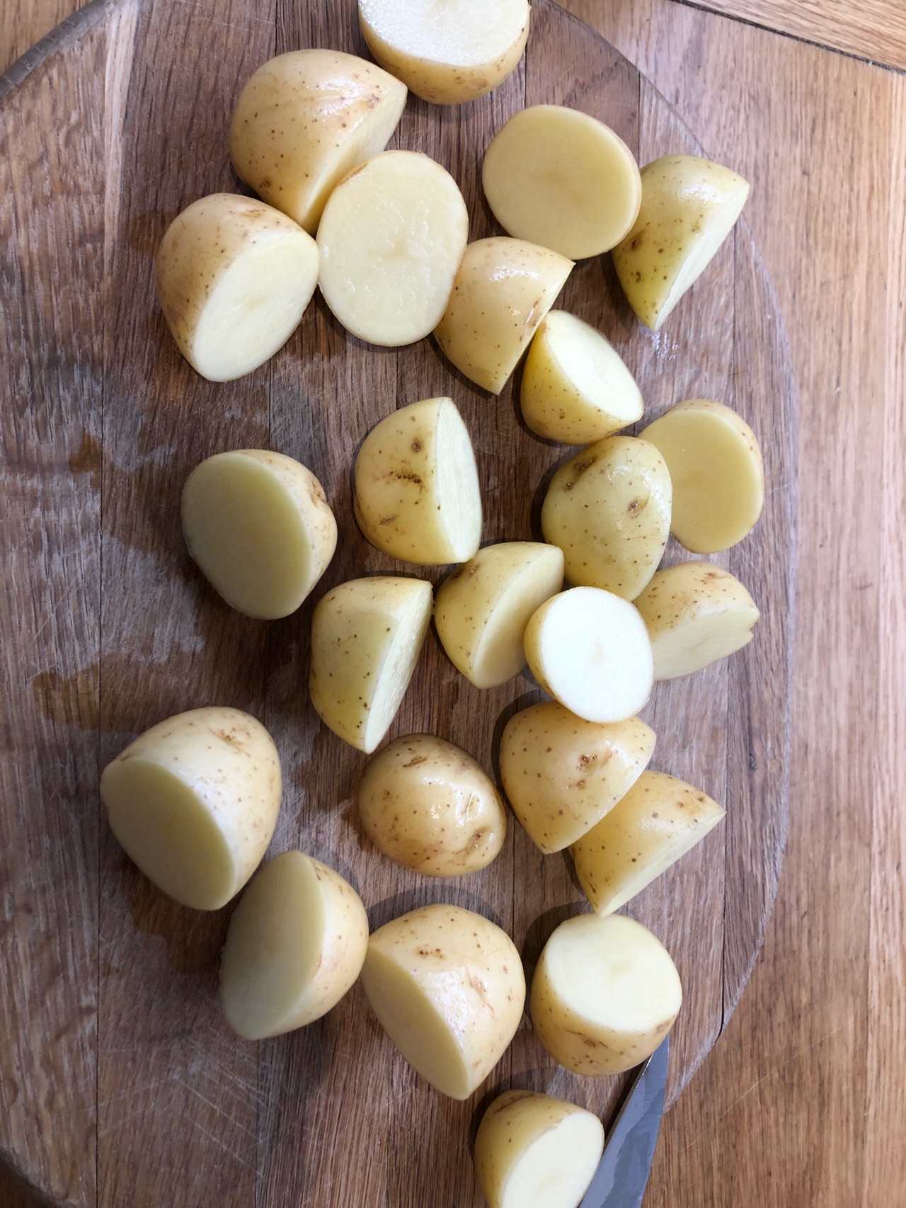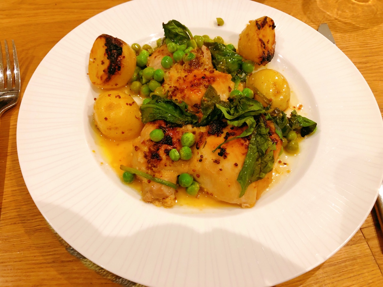 辅料:鸡腿脱骨8个、蜂蜜两勺、蒜泥适量、柠檬汁两个柠檬的量、黄芥末酱两勺、新土豆若干个、菠菜200g、冻豆200g