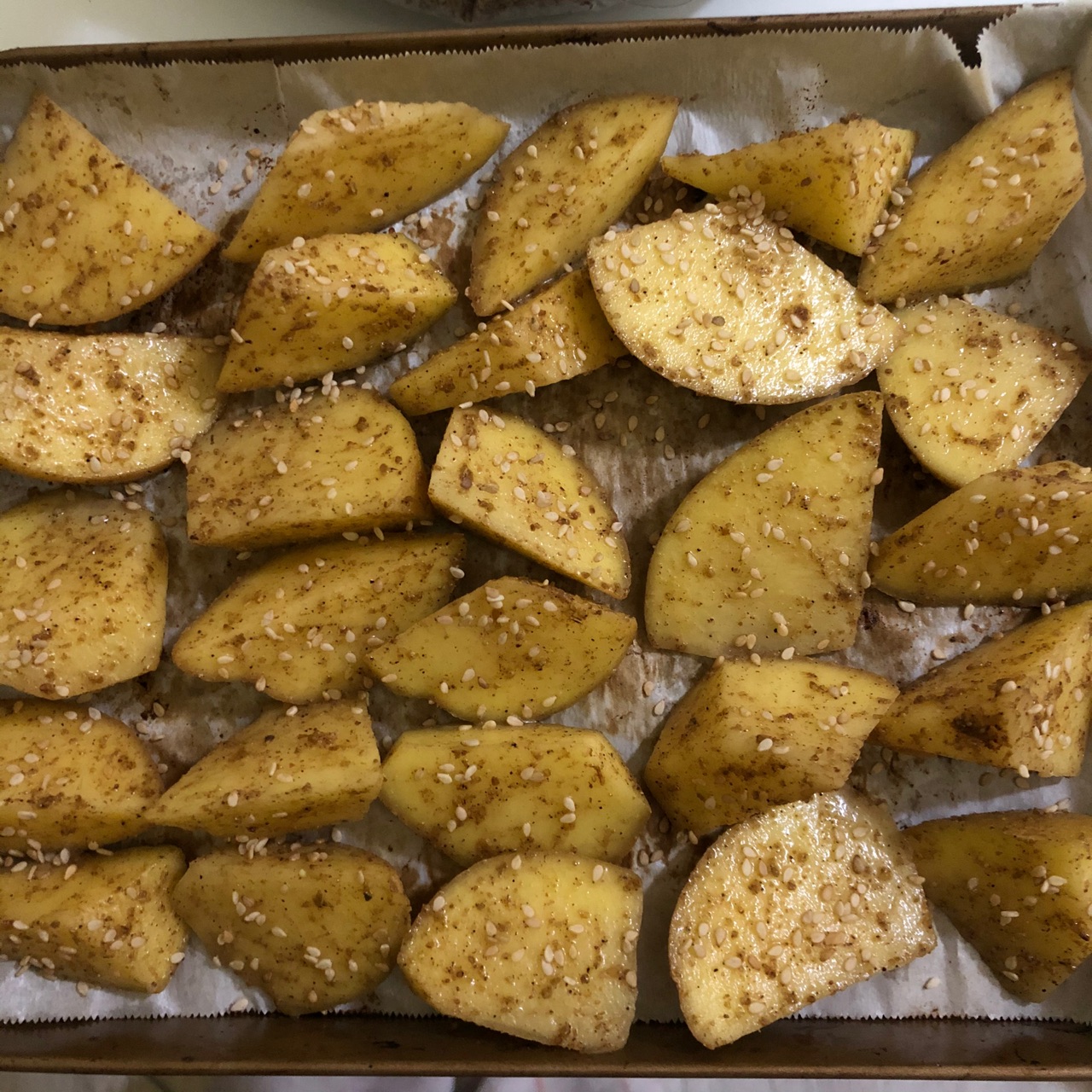 步骤3、用筷子夹到垫了烘焙纸的烤盘上,我撒了些白芝麻(可省略),入烤箱200度烤30分钟至土豆边边有些焦黄即可!