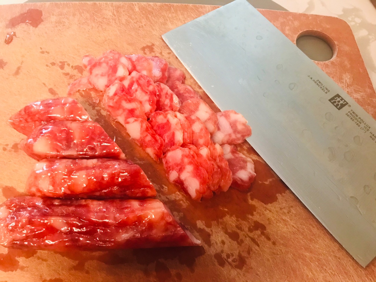 步骤2、腊肠四根,切成薄片,尽量切的薄一些。