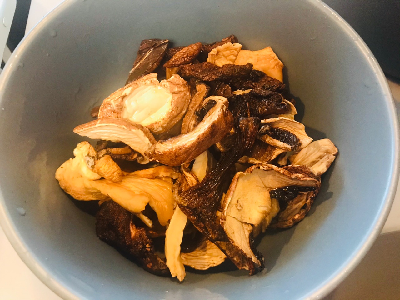 步骤3、取适量香菇洗净,也可用其他的蘑菇。这里我用的是干蘑菇切片。如果是干的香菇的话,需要提前泡软一些。